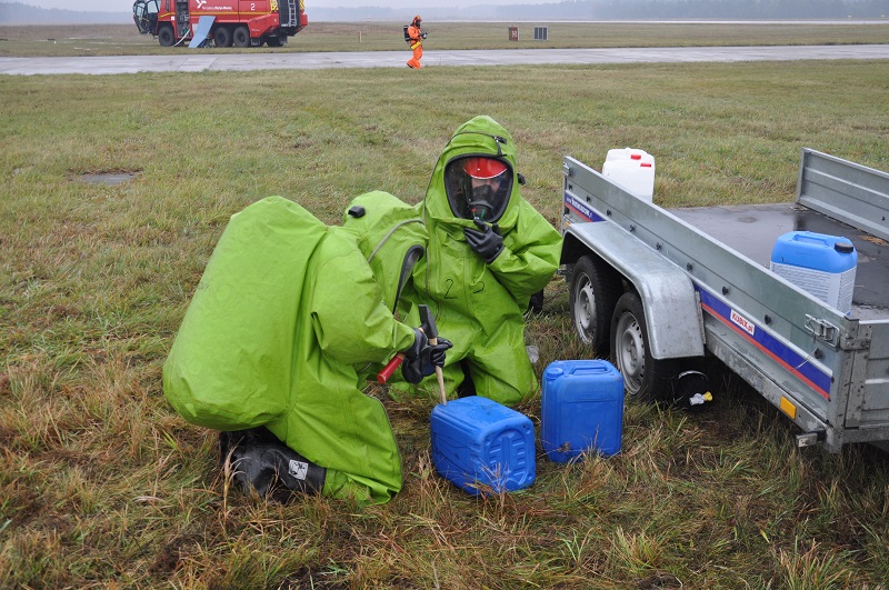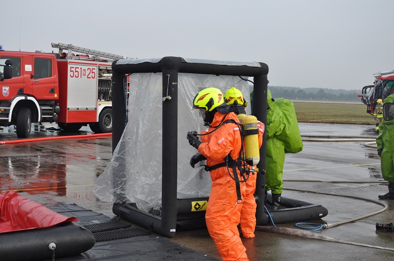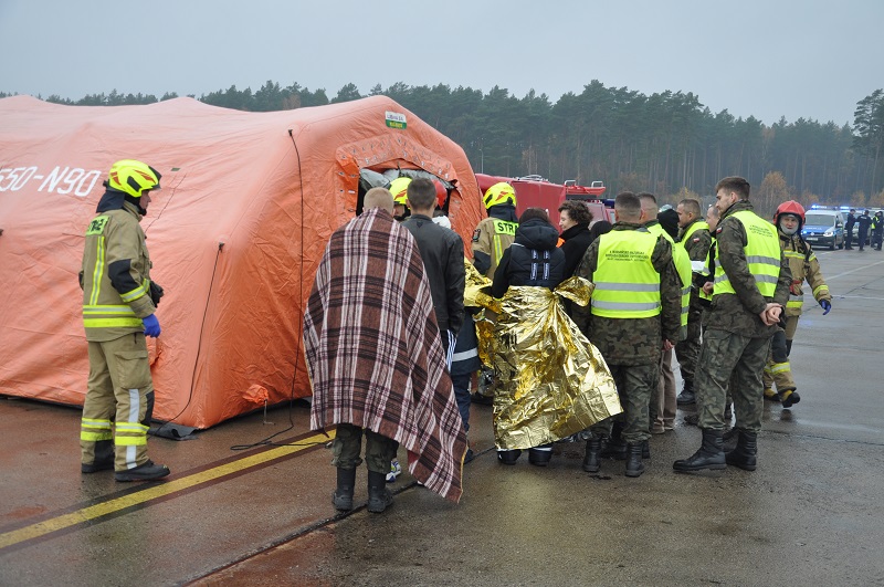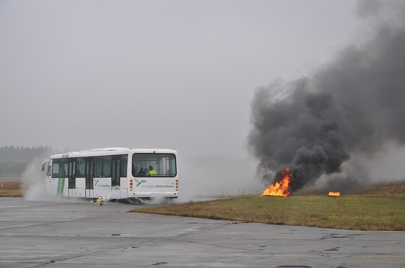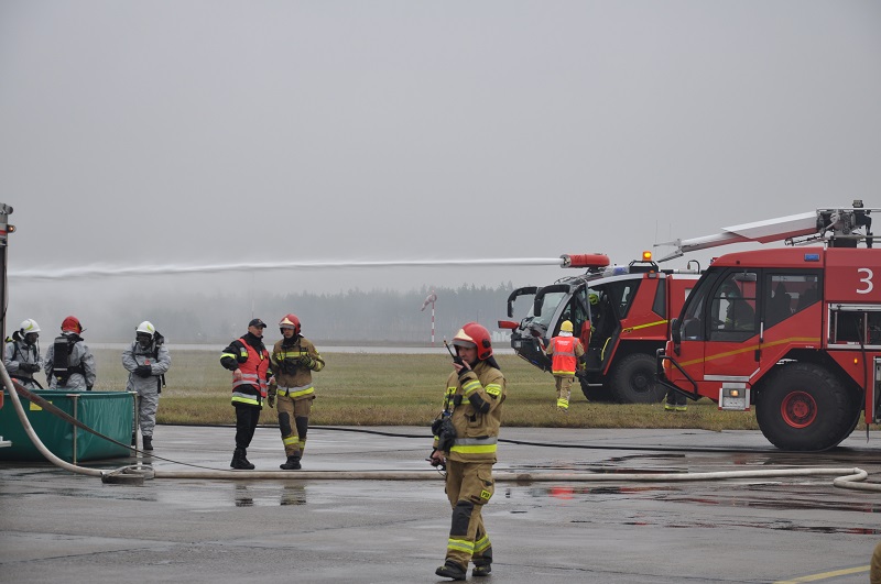 z pasażerami na pokładzie jest zmuszony do awaryjnego lądowania. Ze względu na bardzo złą widoczność wewnątrz kabiny samolotu spowodowaną zadymieniem, zjeżdża on na trawiastą część lotniska ze znaczną prędkością, co powoduje uszkodzenie jego podwozia oraz uszkodzenie pojazdu CARGO zawierającego beczki. W wyniku zdarzenia zapaleniu ulega wyciekające z samolotu paliwo lotnicze, a z uszkodzonych beczek wydobywa się niezidentyfikowana substancja. Ćwiczenia były sprawdzeniem scenariusza działania służb lotniska oraz innych służb i instytucji przewidzianych do działań podczas wypadku statku powietrznego na terenie lotniska. W manewry zaangażowane były liczne służby oraz jednostki ochrony przeciwpożarowej m.in. 3 zastępy z Lotniskowej Służby Ratowniczo-Gaśniczej, 3 zastępy Specjalistycznej Grupy Ratownictwa Chemiczno-Ekologicznego z Olsztyna, 4 zastępy z JRG PSP w Szczytnie, 6 zastępów jednostek OSP z powiatu szczycieńskiego oraz Wojska Obrony Terytorialnej i Policja. Podczas ćwiczeń zrealizowano zakładane cele, którymi były: ugaszenie pożaru, niedopuszczenie do zapalenia się samolotu, ewakuacja i udzielenie kwalifikowanej pierwszej pomocy poszkodowanym, neutralizacja substancji niebezpiecznej oraz zorganizowanie skutecznego zaopatrzenia wodnego na miejscu prowadzonych działań. Organizacja tego typu ćwiczeń jest doskonałą okazją do przećwiczenia obowiązujących procedur w tym zakresie, pozwalając jednocześnie na ocenienie współpracy pomiędzy służbami, które byłyby zaangażowane w prowadzenie działań ratowniczych podczas rzeczywistego zdarzenia.