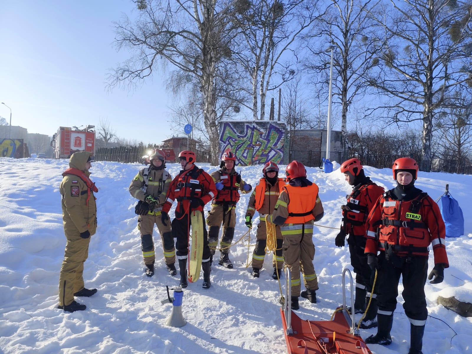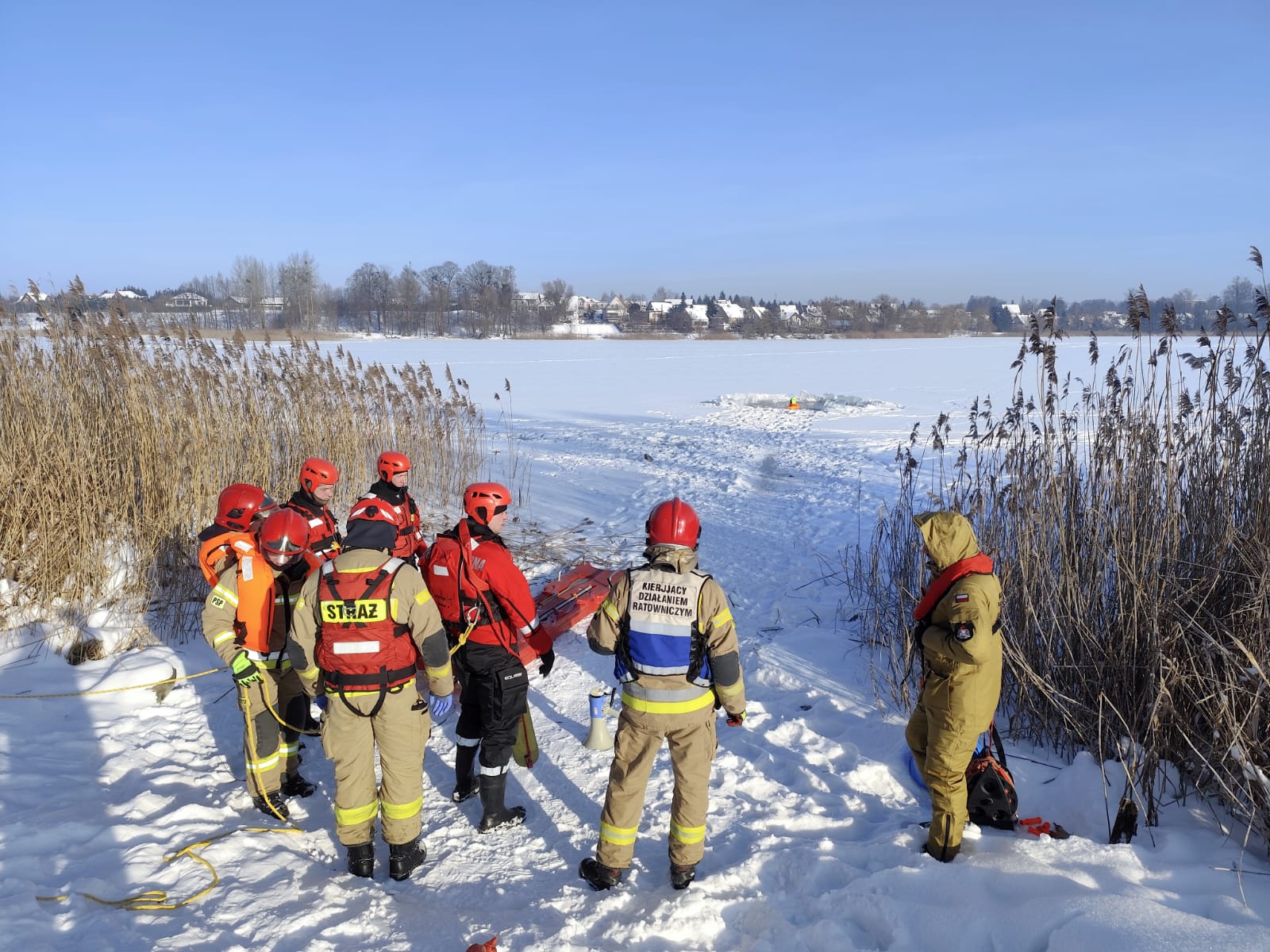 Ćwiczenia z ratownictwa wodnego na zamarzniętym jeziorze Domowym Dużym