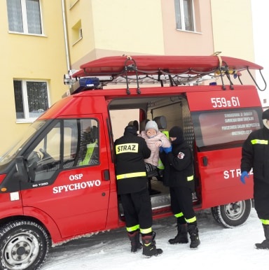 4 lutego br. ratownicy z Ochotniczej Staży Pożarnej w Spychowie, brali udział w pierwszym transporcie osób do punktu szczepień w powiecie szczycieńskim. 3 lutego dyżurny stanowiska kierowania komendanta powiatowego PSP w Szczytnie otrzymał informację od koordynatora gminy Świętajno do spraw szczepień na Covid-19, o potrzebie transportu mieszkanki Spychowa w dniu 4 lutego br. Po zebraniu informacji, skąd należy odebrać osobę starszą i do którego punktu szczepień ją przewieść, dyżurny poinformował prezesa OSP Spychowie, o potrzebie transportu. Strażacy w dniu 4 lutego zrealizowali swoje zadanie bezpiecznie dowożąc starszą panią do wyznaczonego punktu. Po zaszczepieniu strażacy odwieźli kobietę do miejsca zamieszkania.