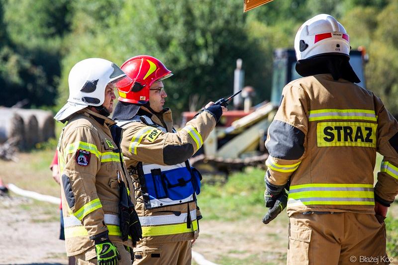 Po przybyciu na miejsce zdarzenia i przeprowadzeniu rozpoznania kierujący działaniem ratowniczym stwierdził, iż ma miejsce w pełni rozwinięty pożar 120 sztuk bel siana oraz budynku inwentarskiego. Budynek inwentarski w wyniku zniszczeń pożarowych uległ zawaleniu. W budynku znajdowały się zwierzęta, których strażacy nie zdołali uratować. Działania prowadzono zarówno w obronie – pożarem zagrożona była ładowarka oraz natarciu – bezpośrednio na pożar. Ugaszone bele siana wyciągano z pożaru na zewnątrz, gdzie przelewano je wodą. Działania trwały ponad 5 godzin, a zaangażowane w nie było 13 zastępów PSP i OSP, w tym 34 strażaków.