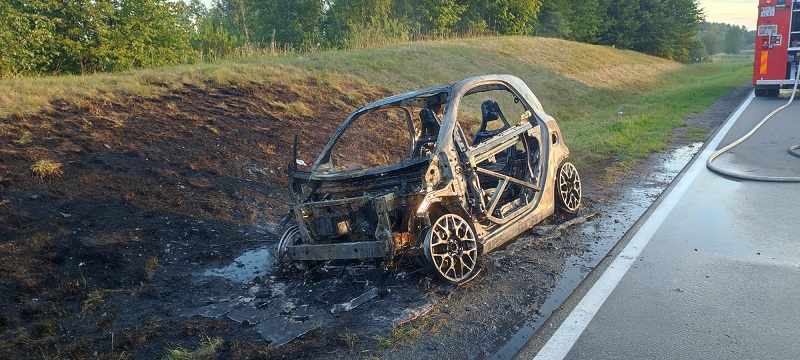 Po przybyciu na miejsce zdarzenia i przeprowadzeniu rozpoznania kierujący działaniem ratowniczym potwierdził, iż ma miejsce pożar samochodu osobowego marki Smart. W trakcie przybycia zastępów pojazd był całkowicie objęty ogniem i znajdował się poza pasem ruchu. Pojazdem podróżowały dwie osoby, które bez obrażeń opuściły pojazd przed przybyciem zastępów. Po zabezpieczeniu miejsca zdarzenia strażacy podali dwa prądy wody w natarciu na palący się pojazd. Po sprawnych i skutecznych działaniach gaśniczych pojazd został ugaszony. Niestety ze względu na stopień rozwoju pożaru samochód spalił się doszczętnie.