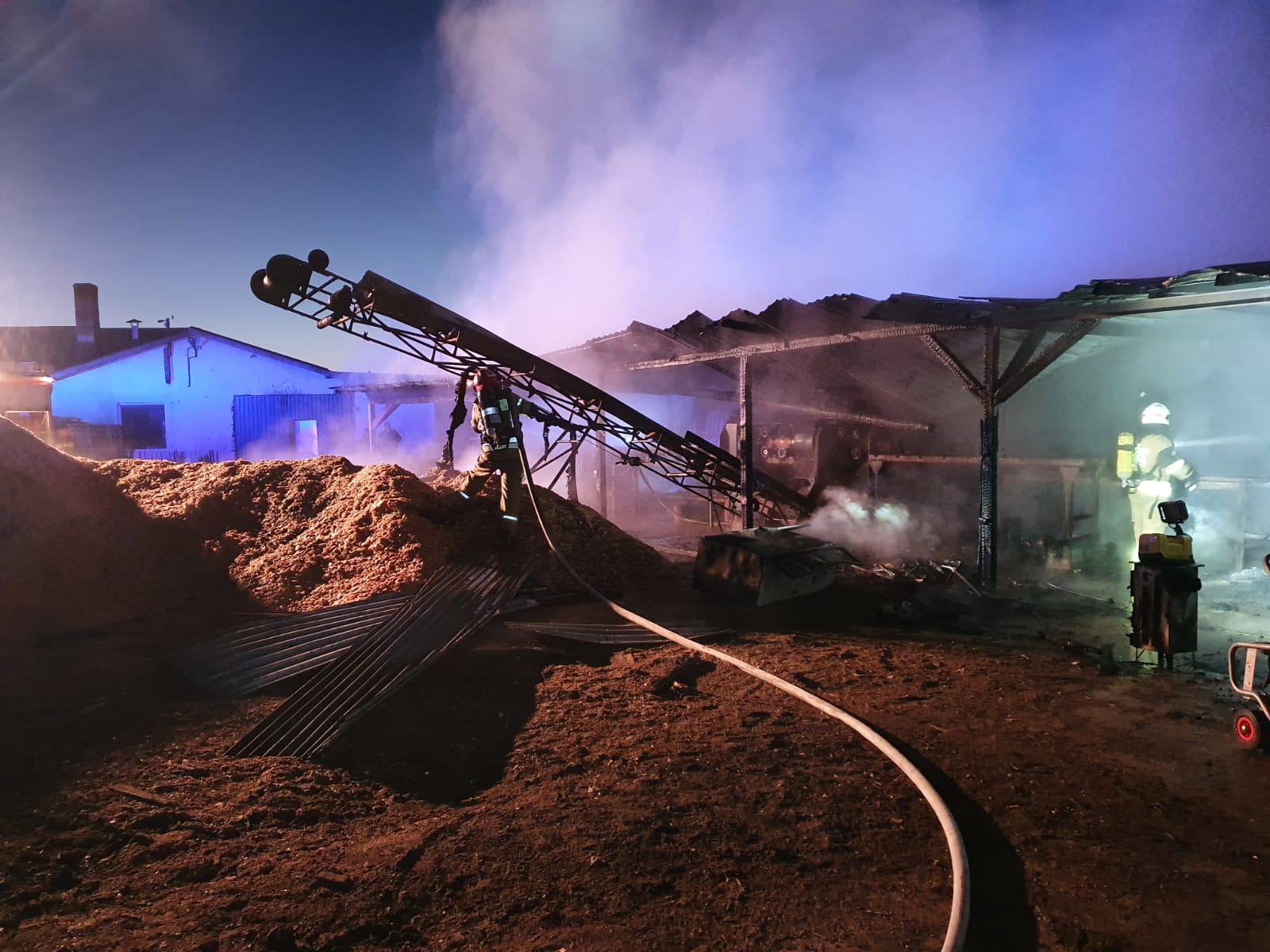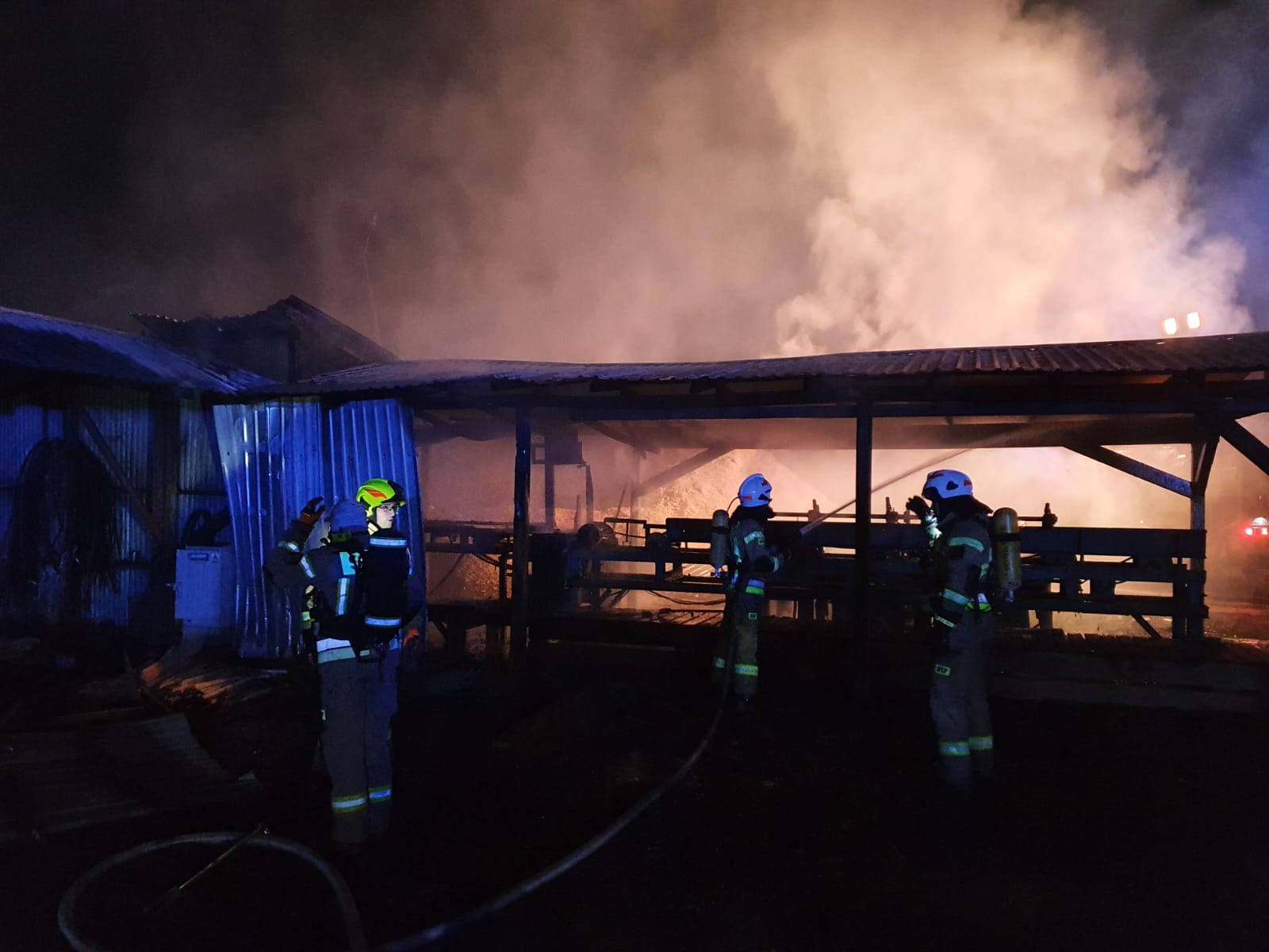 Po dojeździe na miejsce zdarzenia kierujący działaniami ratowniczymi zastał rozwinięty pożar jednej wiaty tartaku, gdzie znajdowała się linii produkcyjna. Rozpoczęto działania ratowniczo-gaśnicze. Pożarem zagrożone były sąsiednie obiekty oraz składowisko usytuowane w pobliżu wiaty.