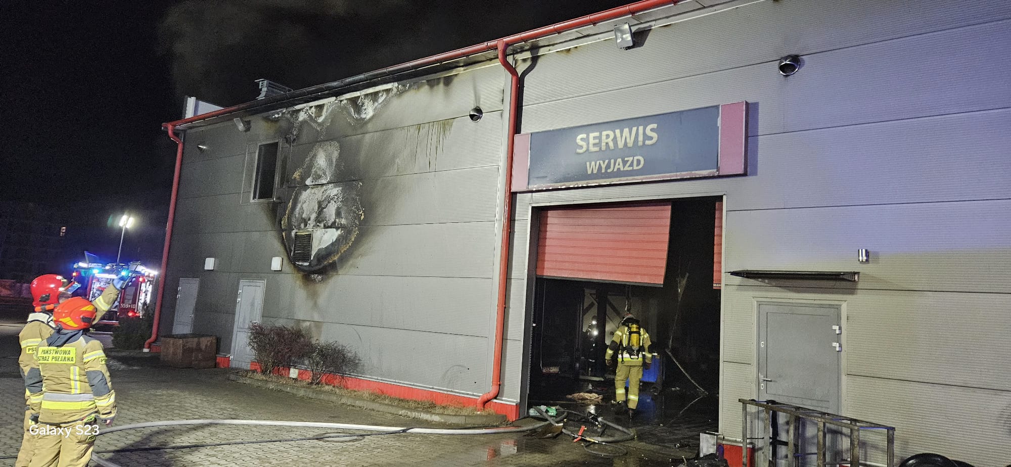 W celu dostania się do budynku wycięto otwór w bramie garażowej, przez który wprowadzono zabezpieczoną rotę z prądem gaśniczym w natarciu. Drugi prąd wody w natarciu do wewnątrz wprowadzono przez główne drzwi wejściowe do strony warsztatu. O godz. 23:30 pożar został opanowany, przystąpiono do oddymiania pomieszczeń. Po oddymieniu sprawdzono budynek kamerą termowizyjną - nie stwierdzono zarzewi ognia. Pożar ugaszono.