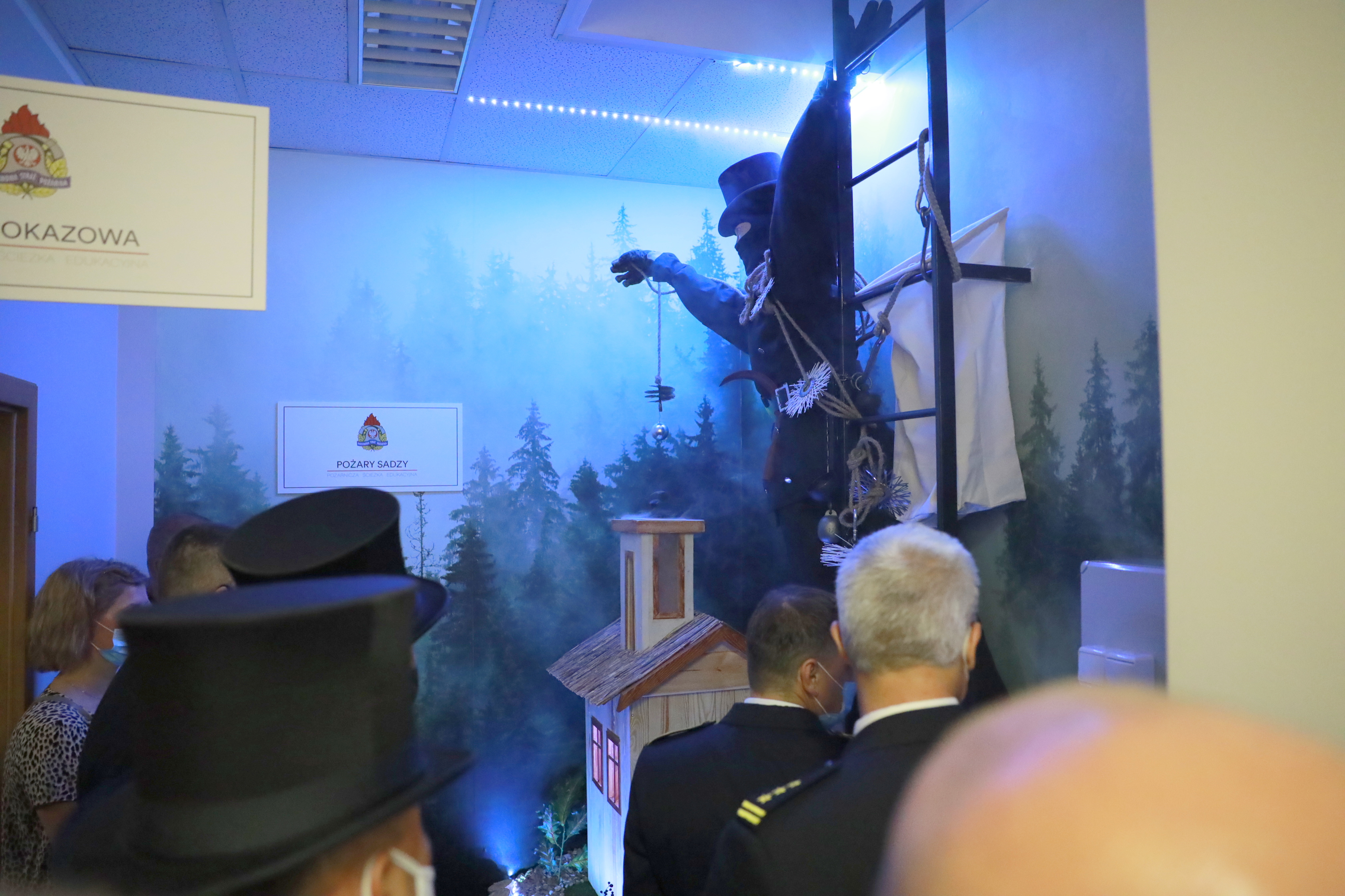 4. Stanowisko pożarów sadzy - znajdujące się na korytarzu, służy zobrazowaniu zagrożenia związanego z pożarami sadzy dla użytkowników budynku. Dzięki specjalnie wykonanej makiecie, uczestnicy prelekcji będą mogli w sposób naoczny zrozumieć to zagrożenie i nauczyć się jak mu zapobiegać.