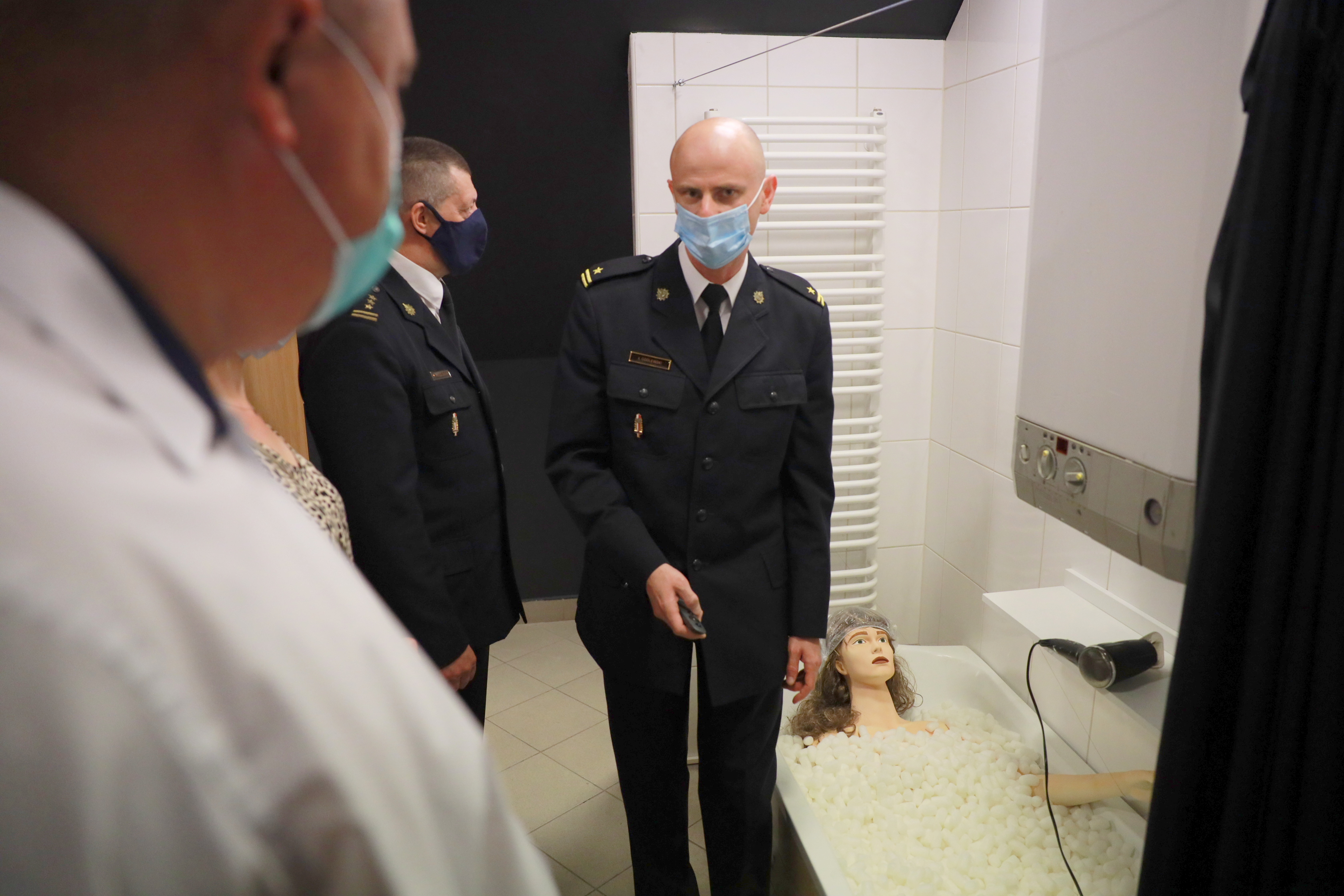 6. Sala ćwiczebna – miejsce, w którym dzieci będą mogły ugasić pożar w zarodku oraz ewakuować poszkodowanego misia. W tym samym pomieszczeniu znajduje się także stanowisko obrazujące zjawisko porażenia prądem elektrycznym, dzięki któremu dzieci nauczą się właściwego postępowania w takiej sytuacji.