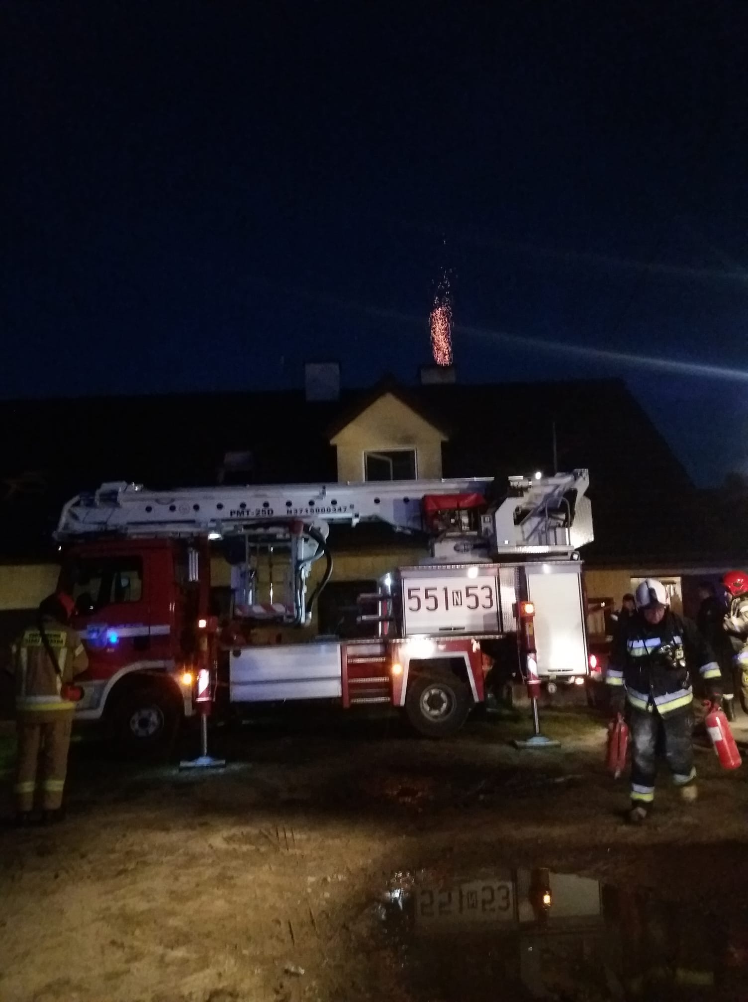 Po dojeździe na miejsce zdarzenia strażacy zastali wydobywające się na wysokość 2m nad kominem iskry i ogień z przewodu kominowego budynku jednorodzinnego. Rozpoczęto działania gaśnicze, używając gaśnic proszkowych. Po ugaszeniu płomieni przy pomocy kuli kominiarskiej uśnięto nagromadzoną sadzę, wybrano ja z wyczystki. Sprawdzono poszczególne kondygnacje budynku brak zadymienia i tlenku węgla. Dzięki szybkiemu zauważeniu pożaru, nie doszło do rozszczelnienia komina- czad nie dostał się do budynku.