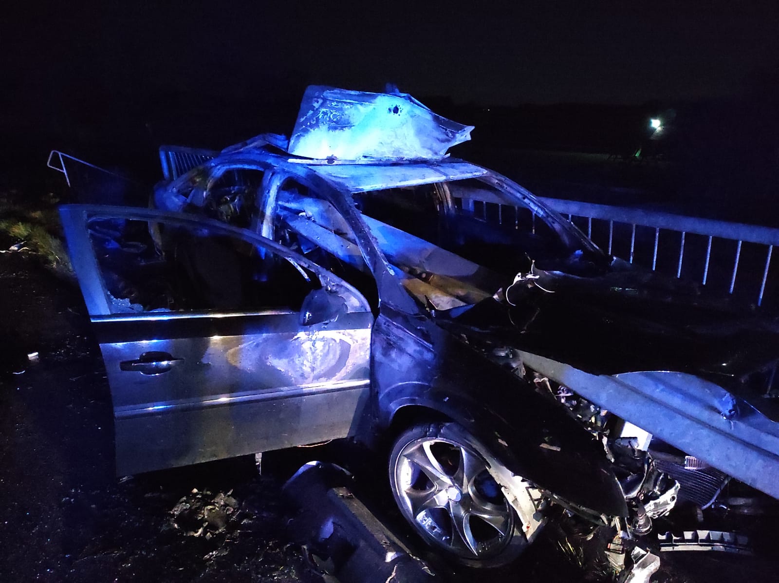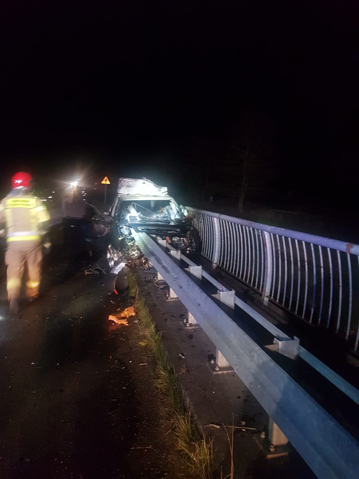 Na miejsce zdarzania jako pierwszy dojechał zastęp OSP Dąbrowy. Kierujący działaniami ratowniczymi zastał objęty płomieniami samochód osobowy marki Opel Vectra, wbity w barierkę energochłonną, która znajdowała się na moście. Barierka przeszyła samochód wzdłuż i wystawała za nim około 5m. Kierowca znajdował się wewnątrz pojazdu. Rozpoczęto działania ratowniczo gaśnicze, podano prąd wody na palące się auto w celu jak najszybszego dotarcia do osoby poszkodowanej i ewakuacji jej na zewnątrz pojazdu. W trakcie działań dotarły na miejsce kolejne jednostki ochrony przeciwpożarowej oraz ZRM. Po ugaszeniu pożaru kierownik zespołu ratownictwa medycznego stwierdził zgon poszkodowanego.