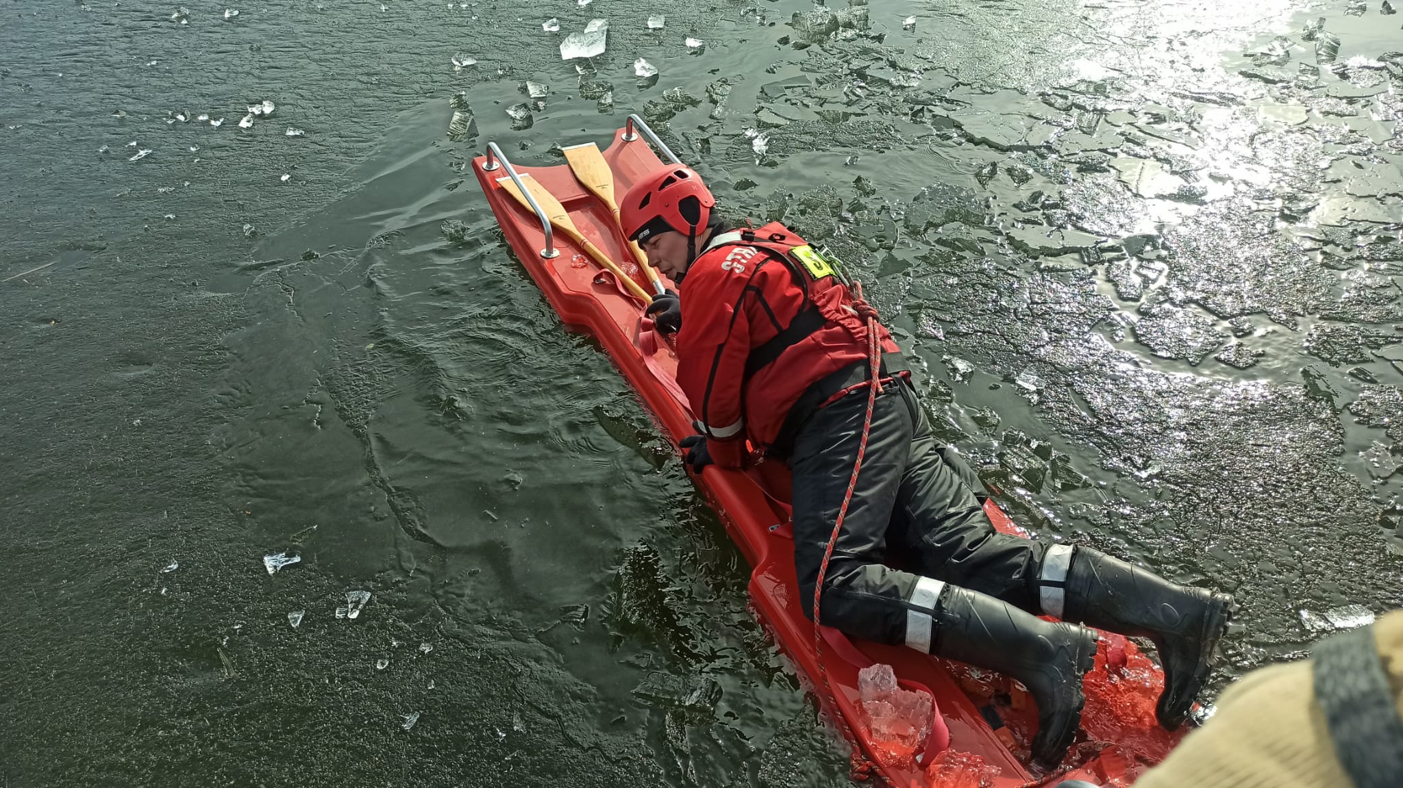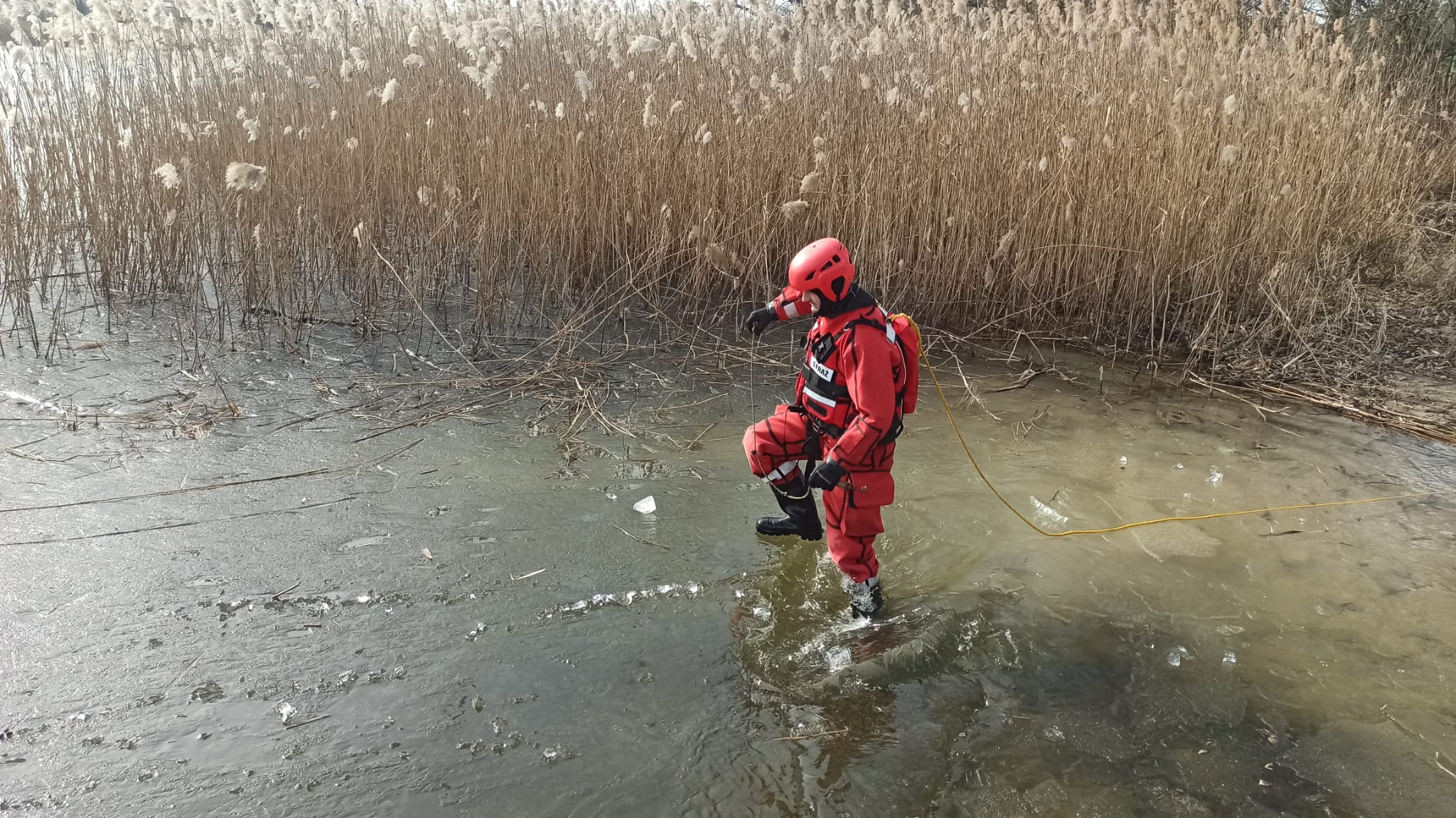 - przygotowaniu i zabezpieczeniu dwóch nurków, którzy zeszli pod powierzchnię wody celem dopłynięcia do miejsca, w którym prawdopodobnie załamał się lód pod osobą poszkodowaną;