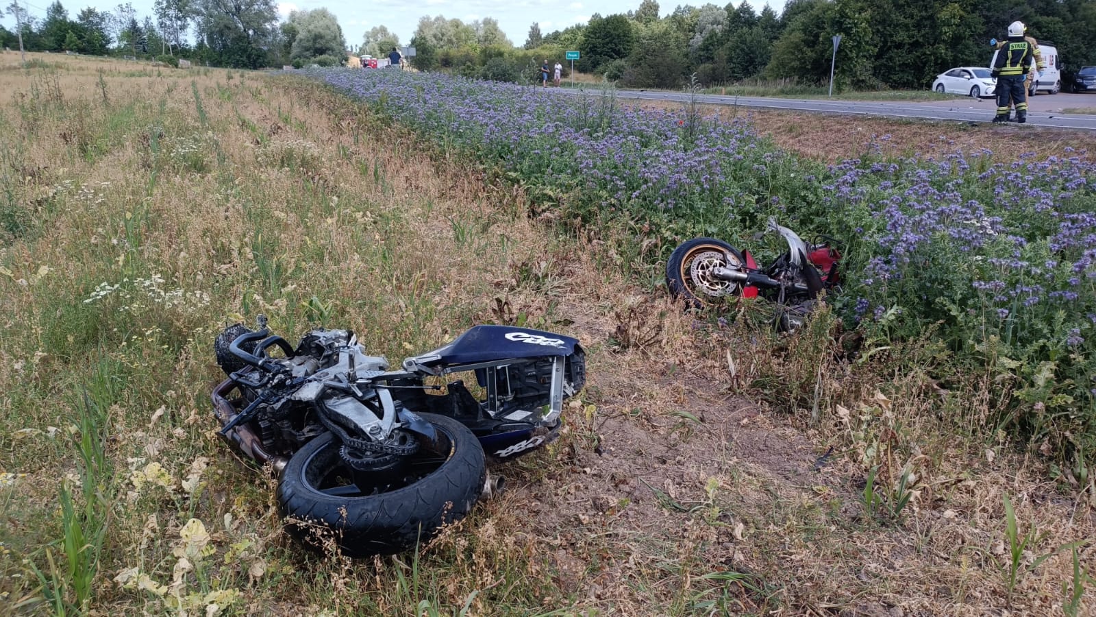 Po dojeździe na miejsce zdarzenia strażacy zastali dwa motocykle poza jezdnią – oba rozpołowione, z częściami porozrzucanymi na odcinku około 100 metrów. W wyniku zderzenia poszkodowane zostały dwie osoby – kierowcy jednośladów.