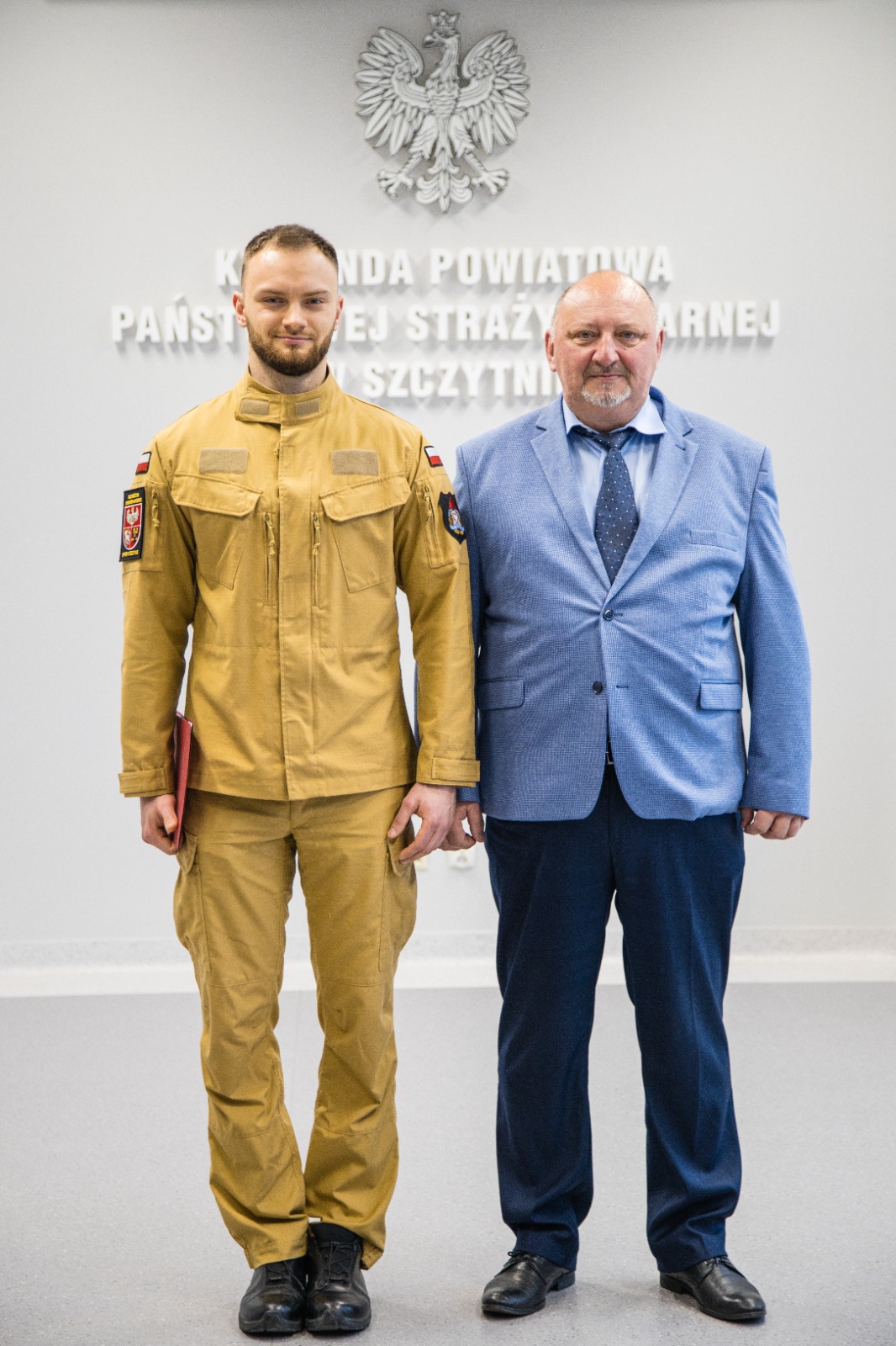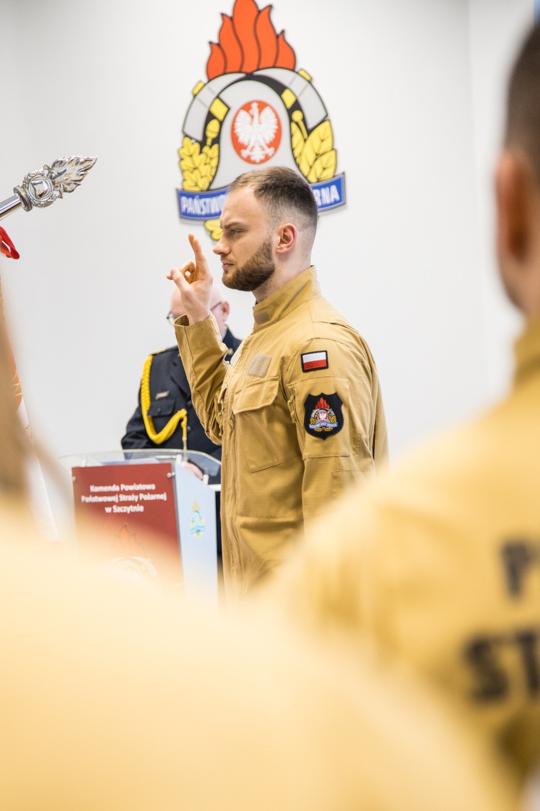 Uroczystość zgromadziła przedstawicieli kierownictwa Komendy Powiatowej oraz ojca strażaka, który towarzyszył mu w tym wyjątkowym dniu. Zgodnie z ceremoniałem ślubowanie przyjął Komendant Powiatowy Państwowej Straży Pożarnej w Szczytnie – bryg. Zbigniew Stasiłojć. Ceremonia odbyła się z udziałem pocztu sztandarowego Komendy Powiatowej PSP w Szczytnie. Po złożeniu roty ślubowania nastąpiło podpisanie oraz uroczyste wręczenie aktów ślubowania.