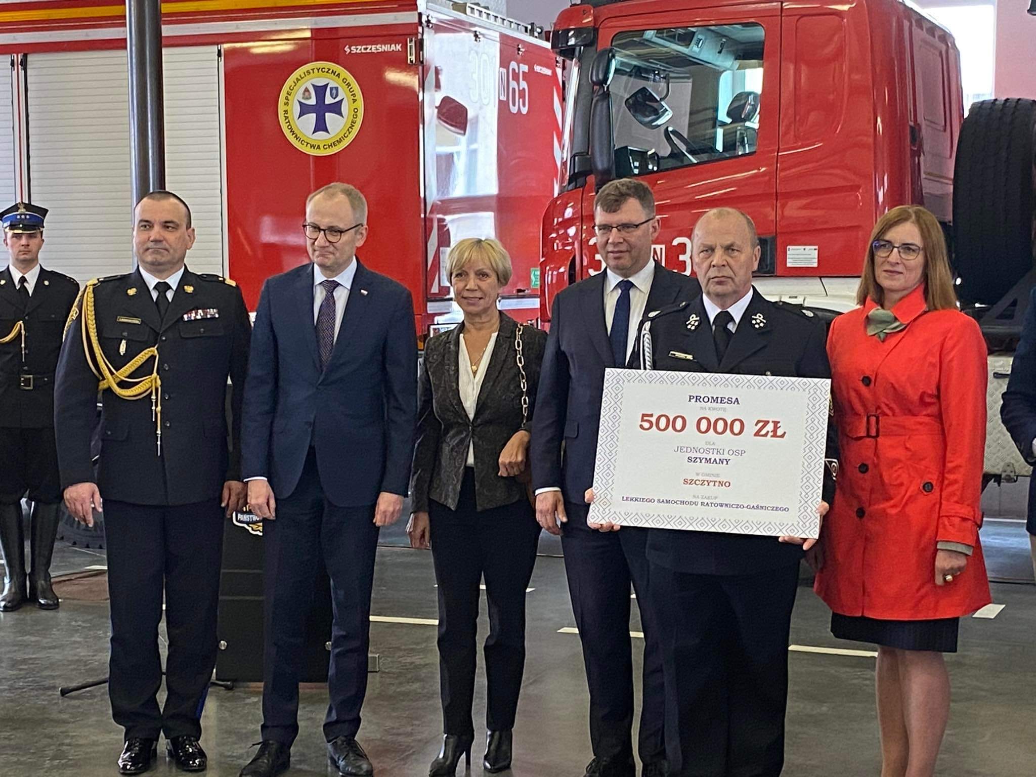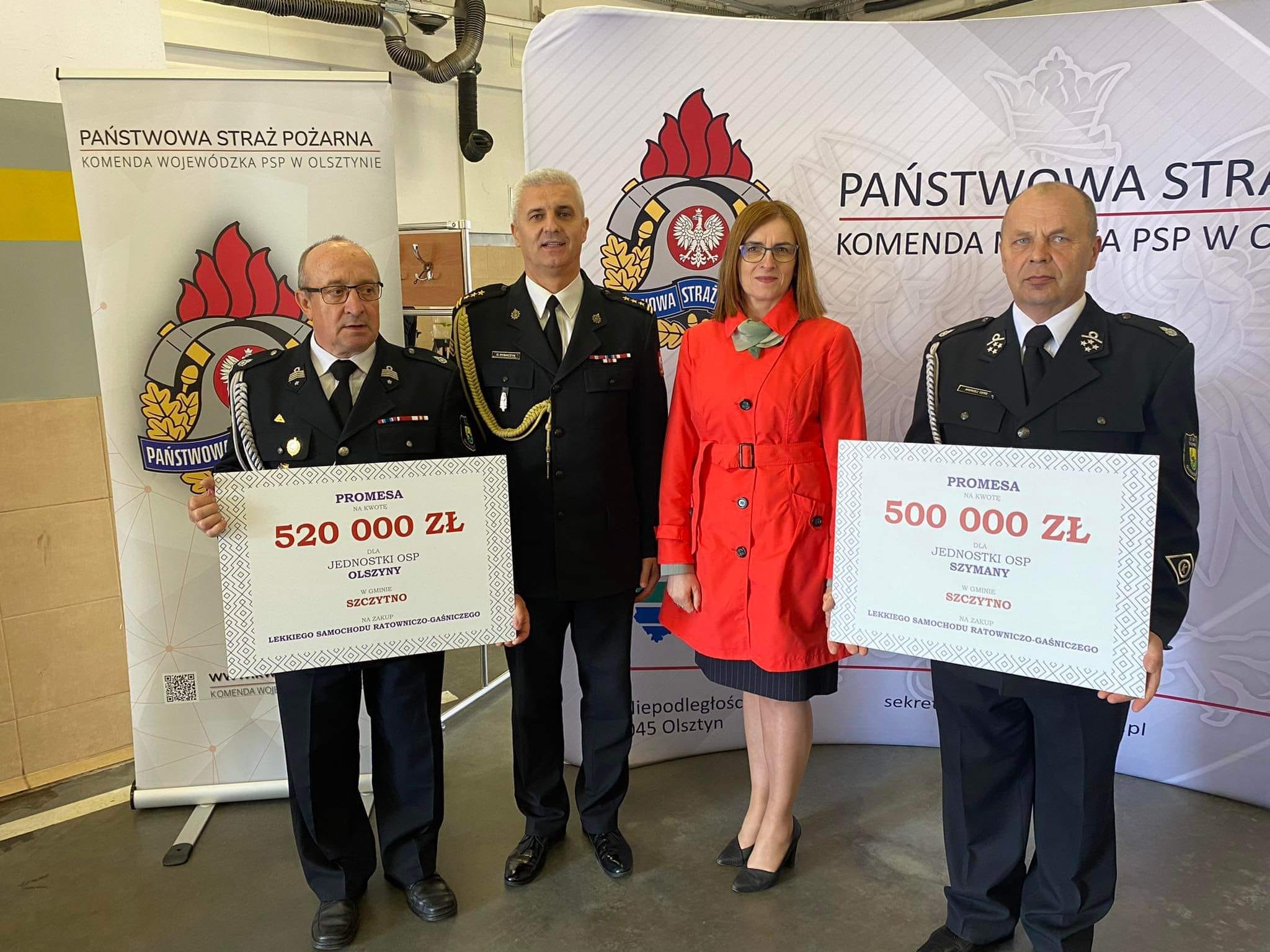 Uroczystość przekazania promes miała miejsce w Komendzie Miejskiej PSP w Olsztynie, gdzie podczas uroczystego apelu, w obecności przedstawicieli rządu, samorządów oraz komendantów powiatowych zostały wręczone dofinansowania. Przekazania promes dokonali Wiceminister MSWiA Błażej Poboży, Wojewoda Warmińsko-Mazurski Artur Chojecki oraz Komendant Wojewódzki PSP w Olsztynie nadbrygadier Tomasz Komoszyński. Komendę Powiatową PSP w Szczytnie reprezentował st.bryg. Grzegorz Rybaczyk. Gminę Szczytno reprezentowała zastępca wójta Ewa Zawrotna, natomiast gminę Pasym burmistrz Cezary Łachmański.