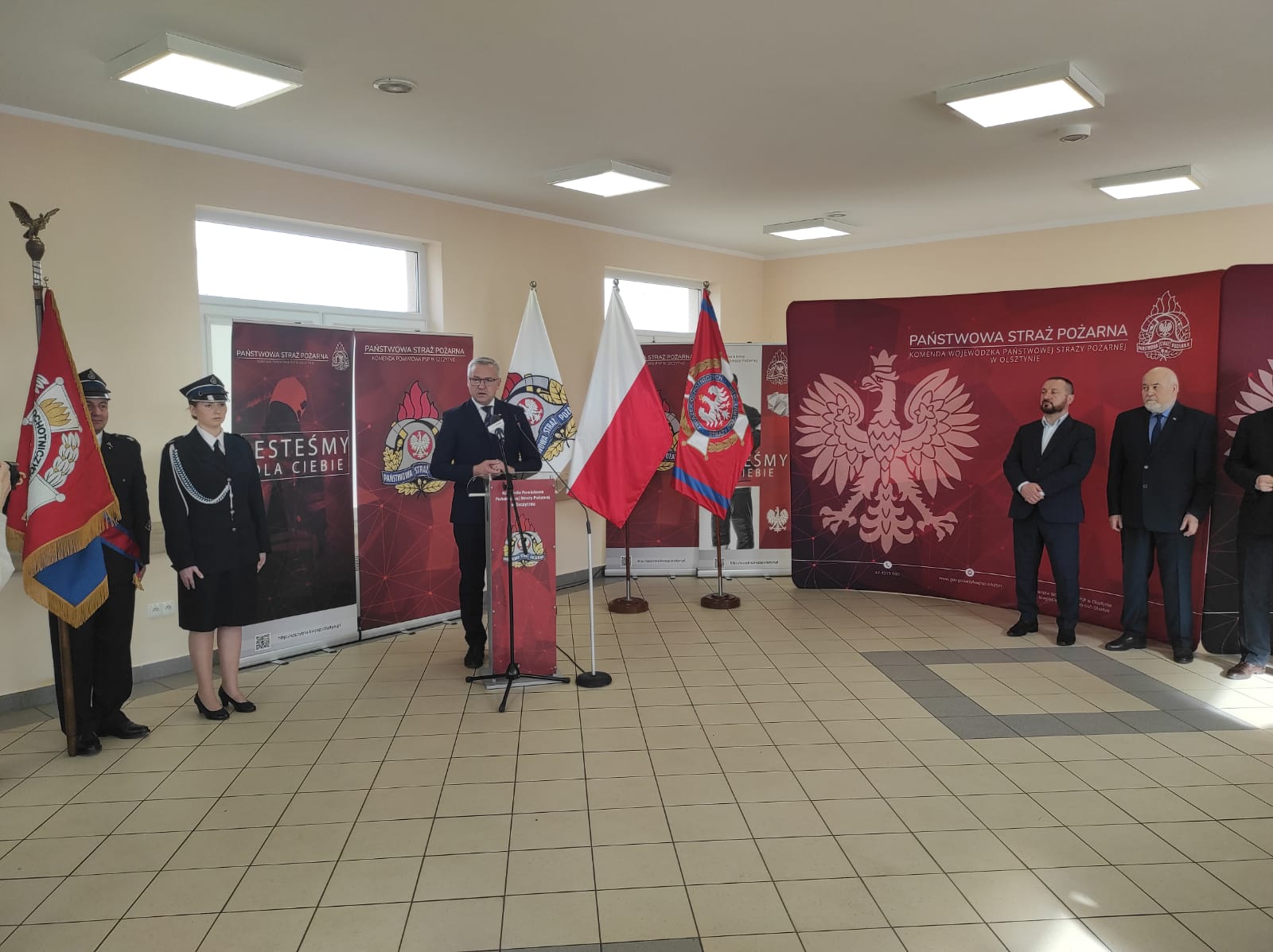 Po złożeniu meldunku przez dowódcę uroczystości kpt. Macieja Woźniaka Panu Ministrowi Błażejowi Pobożemu, nastąpiło odśpiewanie hymnu Rzeczpospolitej Polskiej po czym w imieniu gospodarza uroczystości Pana Wójta Sławomira Wojciechowskiego, zgromadzonych gości przywitała Zastępca Wójta Gminy Szczytno Pani Ewa Zawrotna. Kolejnym oraz najważniejszym punktem spotkania było wręczenie promes dla poszczególnych jednostek Ochotniczych Straży Pożarnych, którego dokonał Pan Minister Błażej Poboży, Pan Poseł Jerzy Małecki, Wojewoda Pan Artur Chojecki, Pan Prezes Jarosław Bogusz, Pan Dyrektor Henryk Żuchowski oraz Pan Komendant nadbryg. Tomasz Komoszyński.