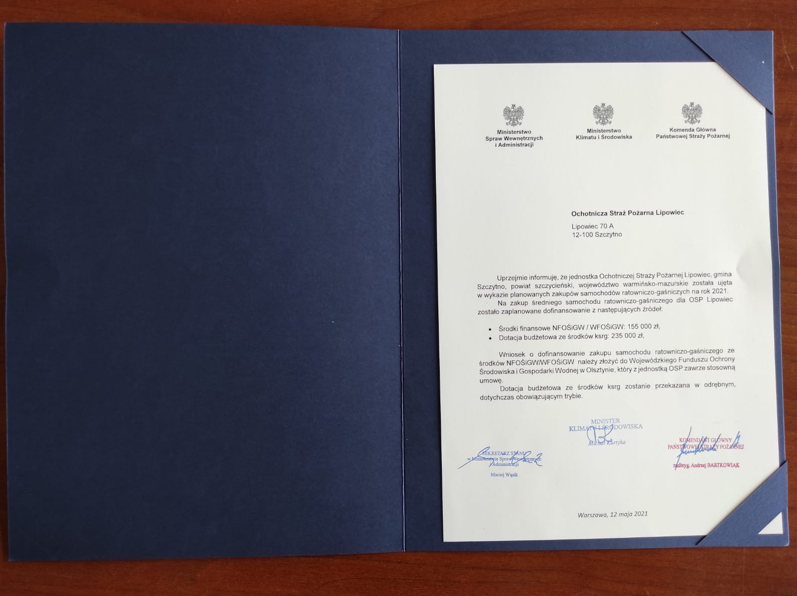 OSP Lipowiec dostało zapewnianie o dofinasowaniu w kwocie 155 000zł z Narodowego Funduszu Ochrony Środowiska i Gospodarki Wodnej oraz 235 000zł z dotacji budżetowej ze środków krajowego systemu ratowniczo- gaśniczego.