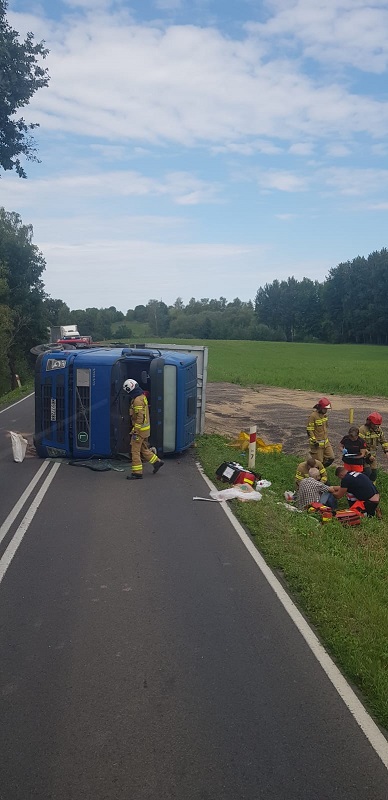 Po przybyciu na miejsce zdarzenia kierujący działaniem ratowniczym potwierdził informację o wypadku ciągnika siodłowego z naczepą. Pojazd przewoził 24 tony rzepaku. W chwili przybycia zastępów znajdował się na lewym boku, na dwóch pasach ruchu. Przewożony ładunek znajdował się w przydrożnym rowie. Poszkodowany został kierowca, u którego ratownicy stwierdzili złamanie kości lewej kończyny górnej. Po udzieleniu kwalifikowanej pierwszej pomocy poszkodowanego przekazano Zespołowi Ratownictwa Medycznego. Dodatkowo zabezpieczono pojazd oraz wycieki płynów eksploatacyjnych. Strażacy pomogli również Policji w kierowaniu ruchem na wyznaczonych objazdach. Działania trwały prawie 6 godzin. Zaangażowane były w nie 4 zastępy, w tym 14 ratowników PSP i OSP.