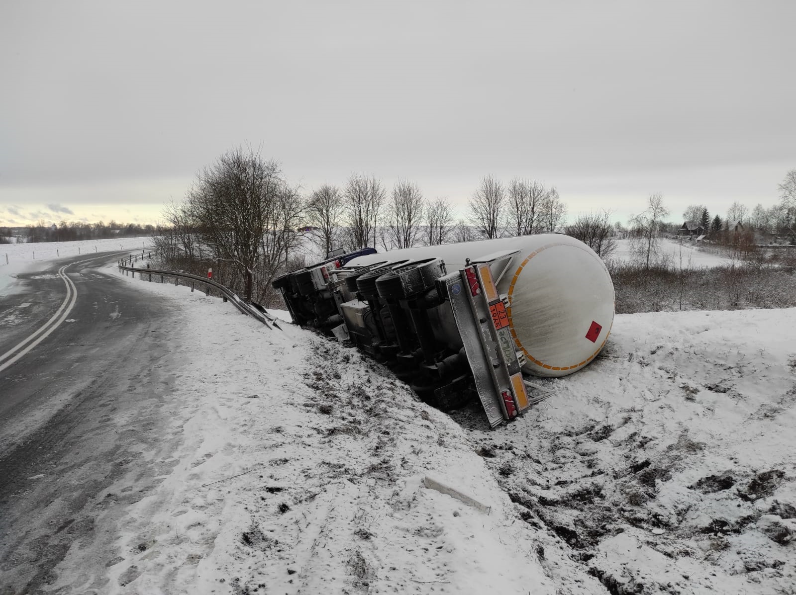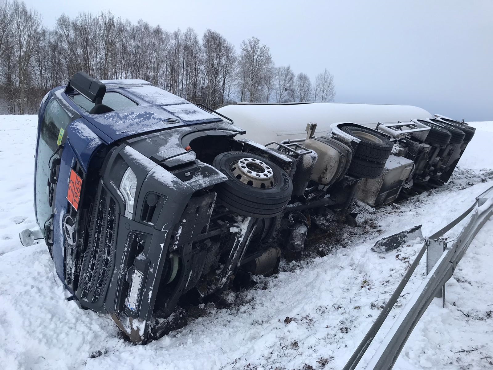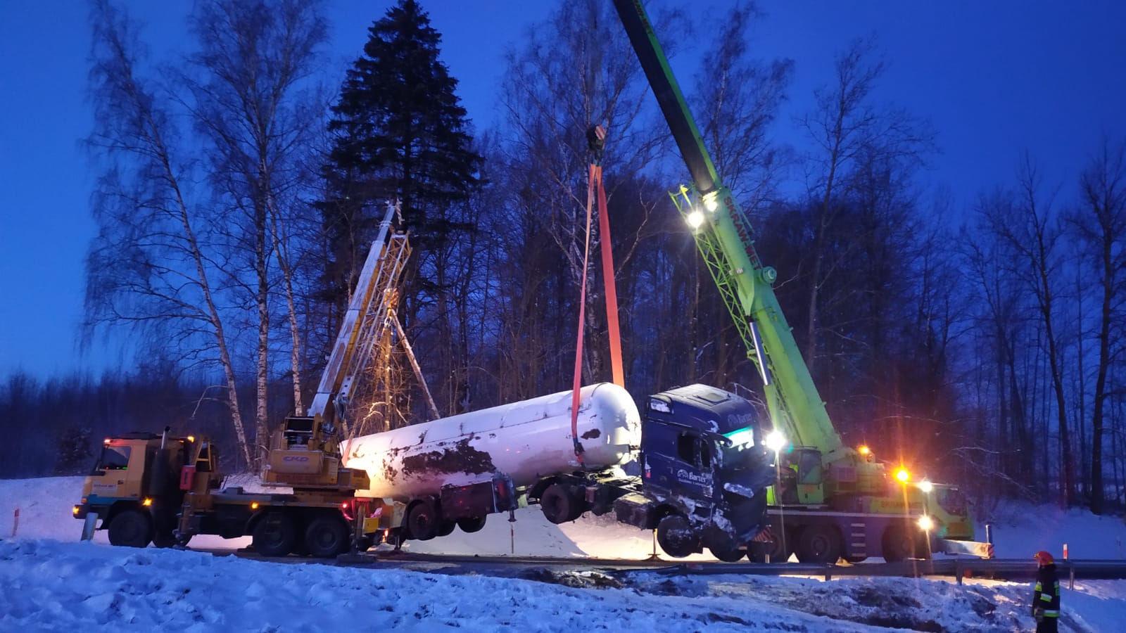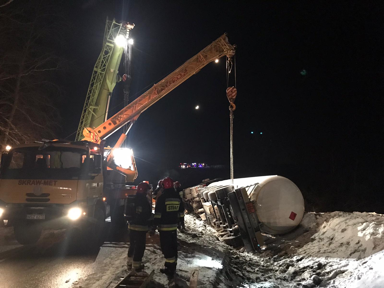 Po przybyciu na miejsce zdarzenia i przeprowadzeniu rozpoznania, kierujący działaniami ratowniczymi potwierdził wypadek samochodu ciężarowego z naczepą-cysterną, przewożącą skroplony gaz propan-butan nr ONZ 1965. W chwili przybycia pierwszych zastępów ciągnik wraz naczepą znajdował się na prawym boku w pobliskim rowie. Pojazdem podróżował 46 letni kierowca, któremu pomocy udzielili ratownicy medycznie najeżdżający na miejsce zdarzenia, tuż przed przybyciem straży pożarnej. Stan kierowcy ratownicy określili jako dobry, po przebadaniu pozostał na miejscu zdarzenia. Działania zastępów straży pożarnej polegały na zabezpieczeniu miejsca zdarzenia poprzez zablokowanie drogi pojazdami pożarniczymi w obu kierunkach, wyznaczenie strefy bezpiecznej w odległości 150m od pojazdu, niedopuszczenie osób postronnych w miejsce prowadzonych działań. Potwierdzono rodzaj i ilość przewożonego medium - skroplony gaz propan-butan nr ONZ 1965 w ilości 50 tys. litrów. Podczas próby oceny uszkodzeń cysterny oraz próby odczytu parametrów z przyrządów pomiarowych cysterny - stwierdzono uszkodzenia poszycia płaszcza zewnętrznego. Z wykorzystaniem miernika wielogazowego oraz poprzez ocenę wizualną stwierdzono brak wycieków, brak możliwości odczytu parametrów z urządzeń pomiarowych ze zbiornika (cysterna przewrócona na stronę, na której znajdują się przyrządy pomiarowe). We współpracy z Policją zorganizowano objazdy, w celu udrożnienia ruchu.