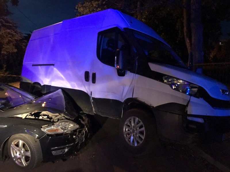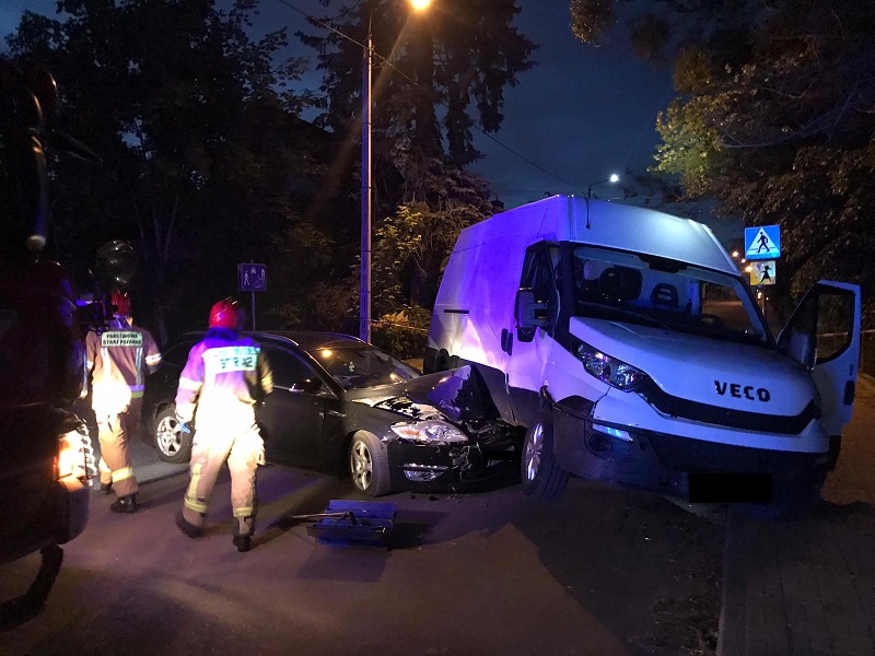 Po dotarciu na miejsce zdarzenia i przeprowadzeniu rozpoznania kierujący działaniem ratowniczym stwierdził, iż miało miejsce zderzenie dwóch samochodów - Iveco Daily oraz Forda Mondeo. Pojazdy znajdowały się na jezdni. W wyniku uderzenia przód forda znalazł się pod busem. Poszkodowana została jedna osoba. Strażacy udzielili jej kwalifikowanej pierwszej pomocy, a następnie została ona przekazana zespołowi ratownictwa medycznego. ZRM zdecydował o zabraniu jej do placówki medycznej. Straty wynikłe z tego zdarzenia wyceniono na 40 tys. zł.