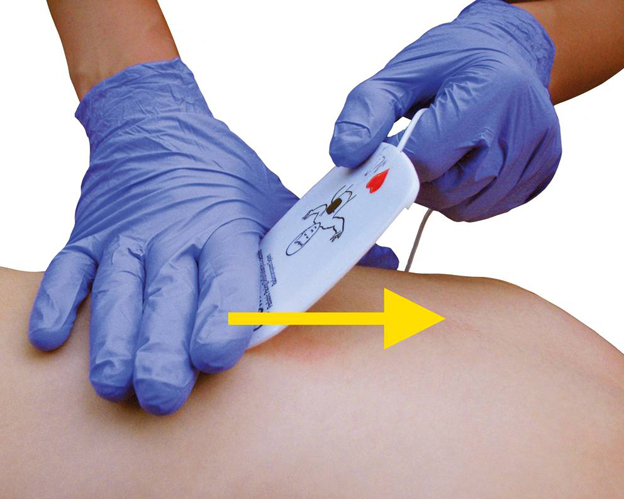Zautomatyzowany defibrylator zewnętrzny powinien zostać użyty u wszystkich poszkodowanych, którzy są nieprzytomni i nie oddychają lub oddychają nieprawidłowo (oddech agonalny). W przypadku podejrzenia wystąpienia zatrzymania akcji serca ratownicy powinni rozpocząć resuscytację krążeniowo-oddechową, wezwać zespół ratownictwa medycznego i jak najszybciej przygotować defibrylator do użycia. Urządzenie kładziemy przy poszkodowanym i uruchamiamy naciskając przycisk „włącz”. Od tego momentu AED za pomocą komunikatów głosowych będzie instruował operatora o kolejnych czynnościach, które należy wykonać, aby prawidłowo wykonać procedurę defibrylacji. W pierwszej kolejności odsłaniamy klatkę piersiową poszkodowanego, a jeśli jest to konieczne – rozcinamy ubranie nożyczkami. Otwieramy opakowanie elektrod i wyciągamy je. Na każdej elektrodzie znajduję się rysunek pokazujący, jak prawidłowo umieścić je na klatce piersiowej pacjenta. Po odklejeniu elektrody od plastikowej podkładki naklejamy ją lepką stroną z prawej strony mostka, poniżej obojczyka, a drugą umieszczamy w linii pachowej środkowej, bocznie od lewej brodawki sutkowej – jest to tzw. układ przednio-boczny (fot. 2). Naklejanie elektrody rozpoczynamy od jednego końca, mocno dociskając ją do klatki piersiowej, aż będzie całkowicie przylegała do ciała pacjenta (fot. 3).