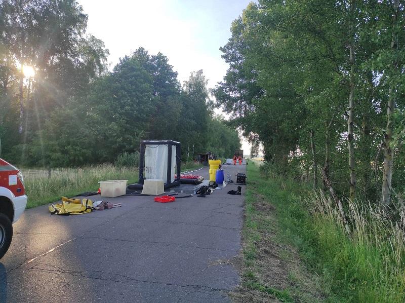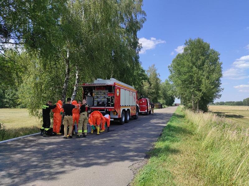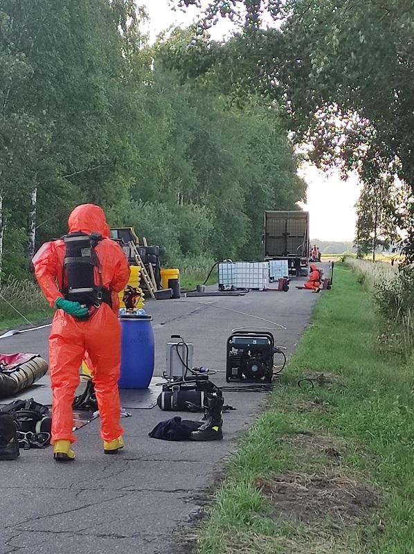 W związku z zagrożeniem związanym z ww. substancją podjęto działania mające na celu zabezpieczenie miejsca zdarzenia oraz wyznaczenie strefy niebezpiecznej w promieniu 150 m od pojazdu. Następnie strażacy dokonali sprawdzenia pojazdu, po którym okazało się, iż ze zbiorników wydobywa się wodorotlenek sodu. Na miejsce zdarzenia zadysponowano Specjalistyczną Grupę Ratownictwa Chemiczno-Ekologicznego z Olsztyna.