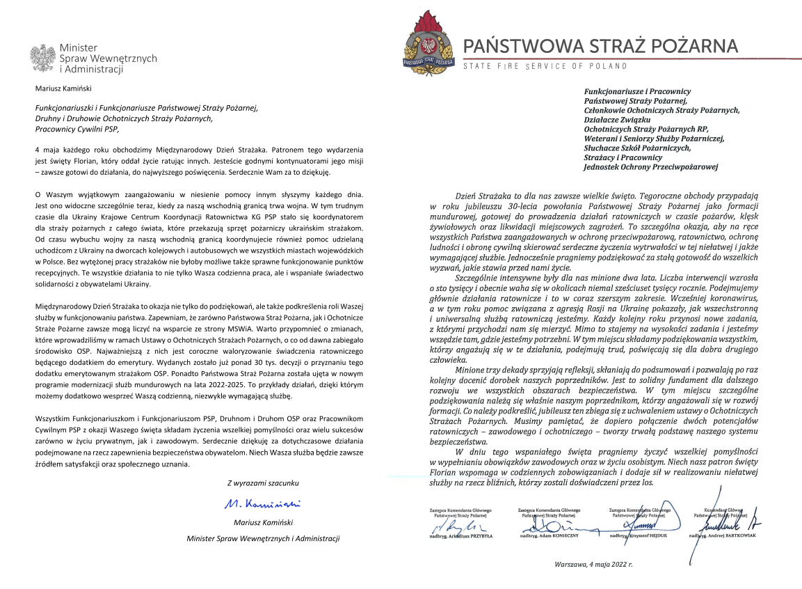Minister Spraw Wewnętrznych i Administracji Pan Mariusz Kamiński oraz Komendant Główny Państwowej Straży Pożarnej nadbryg. Andrzej Bartkowiak składają życzenia z okazji Dnia Strażaka.