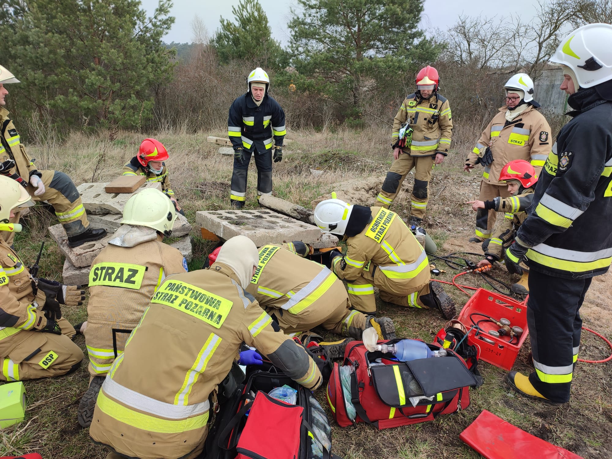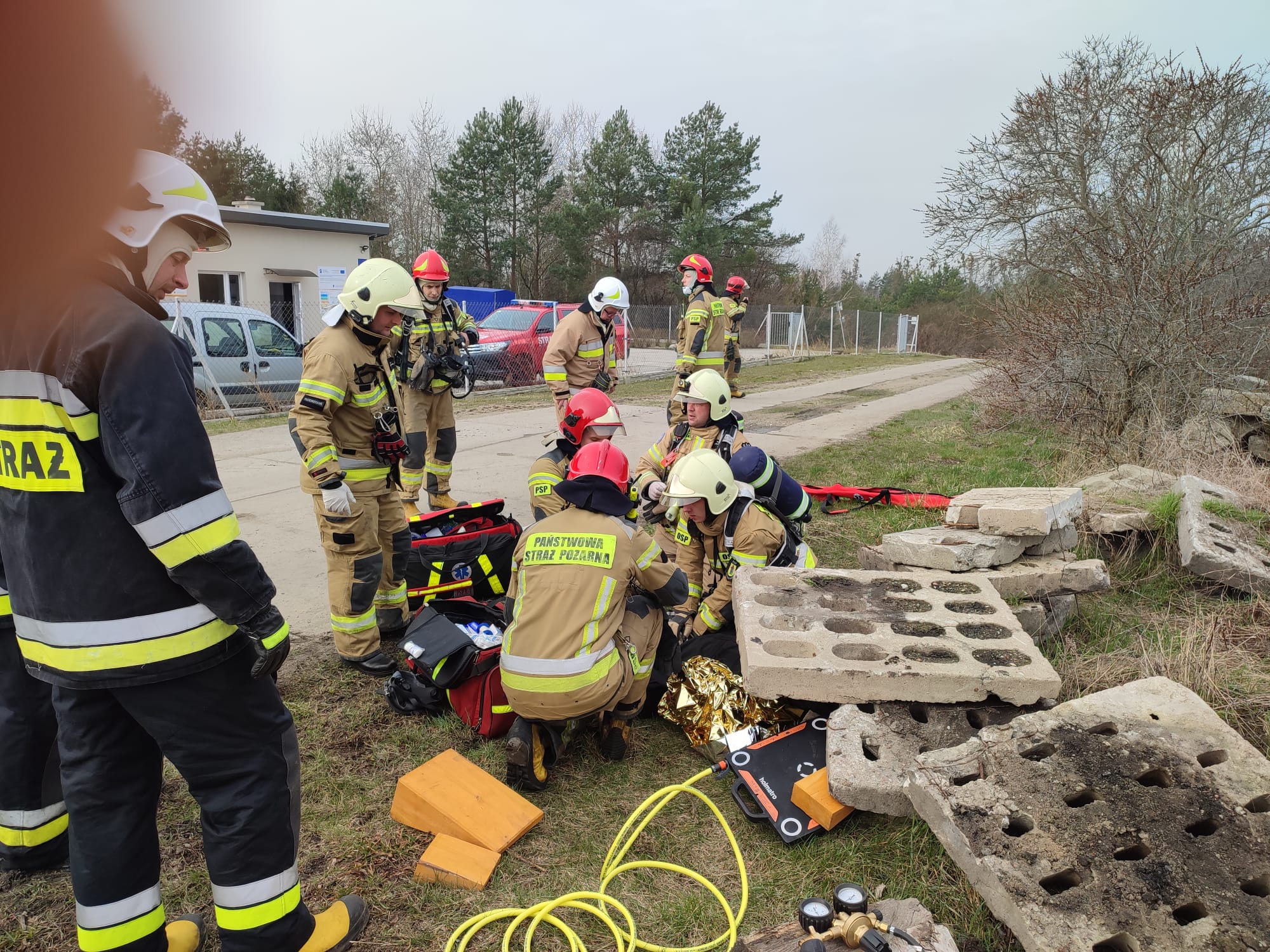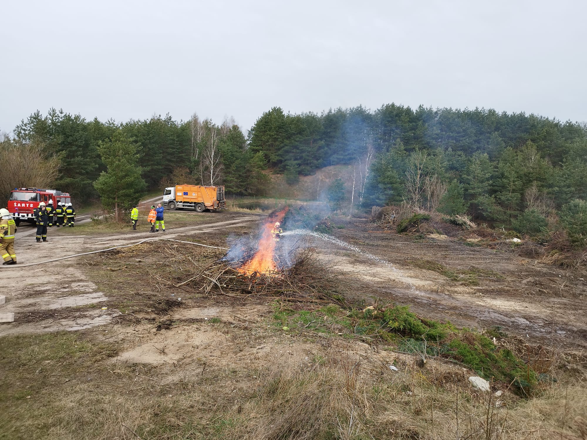 Scenariusz ćwiczeń zakładał: powstanie pożaru w miejscu składowania odpadów wyniku zaprószenia ognia. W wyniku zdarzenia nastąpił zapłon składowanych materiałów palnych, które znajdują się na placu w pobliżu lasu. Podczas próby ugaszenia pożaru przez pracowników przy użyciu ciągnika z turem dochodzi do przygniecenia pracownika przez płytę drogową.