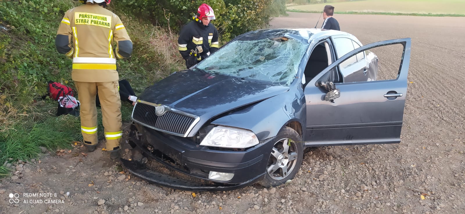 Po dojeździe zastępów zastano samochód osobowy marki Skoda po dachowaniu, stojącego na kołach poza drogą na pobliskim polu. W wyniku zdarzenia poszkodowanej kobiecie znajdującej się poza pojazdem.