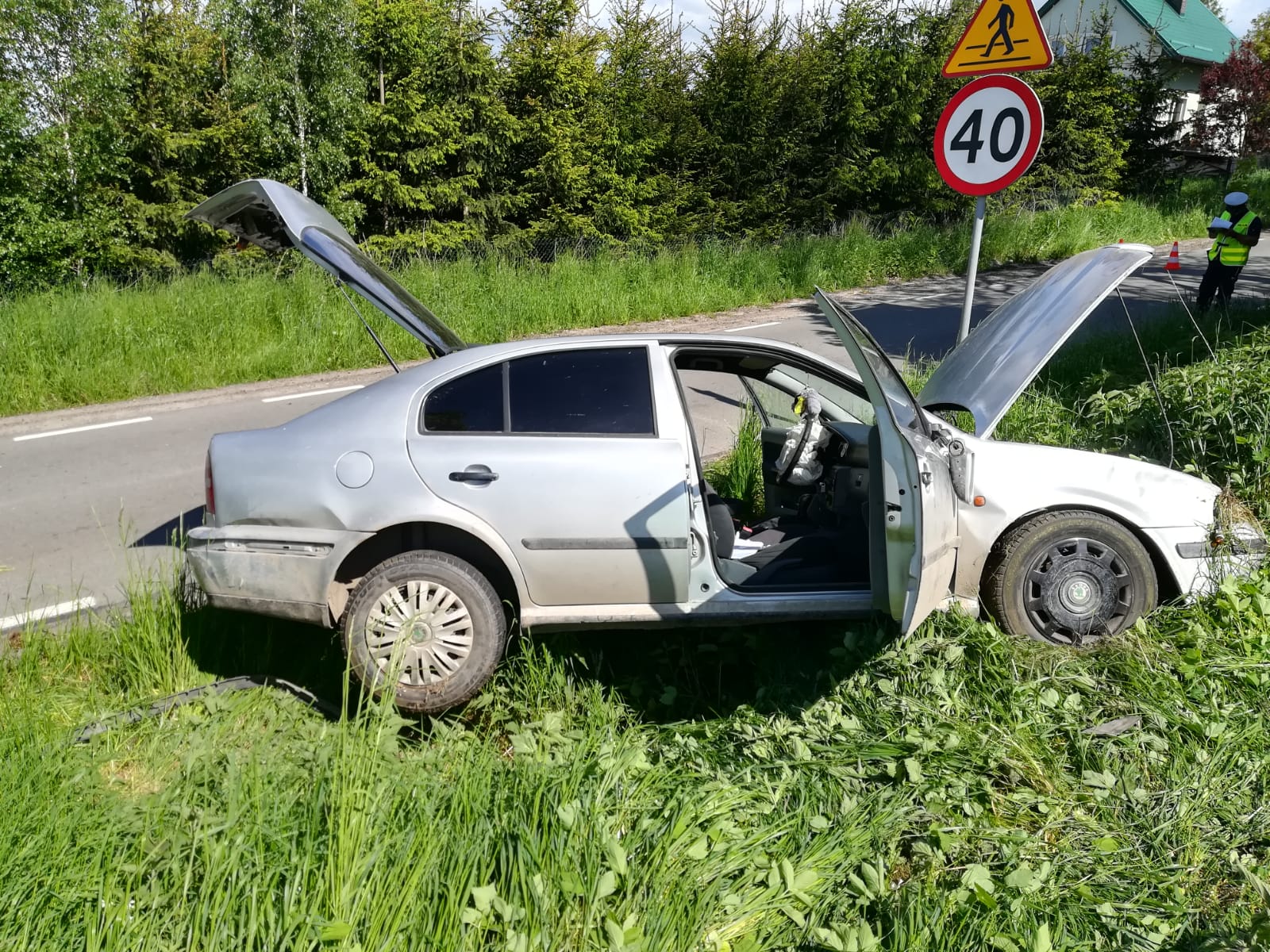 Po dojeździe pierwszych zastępów zastano samochód osobowy marki Skoda po dachowaniu, stojącego na kołach. Osoba poszkodowane pod opieką ZRM.