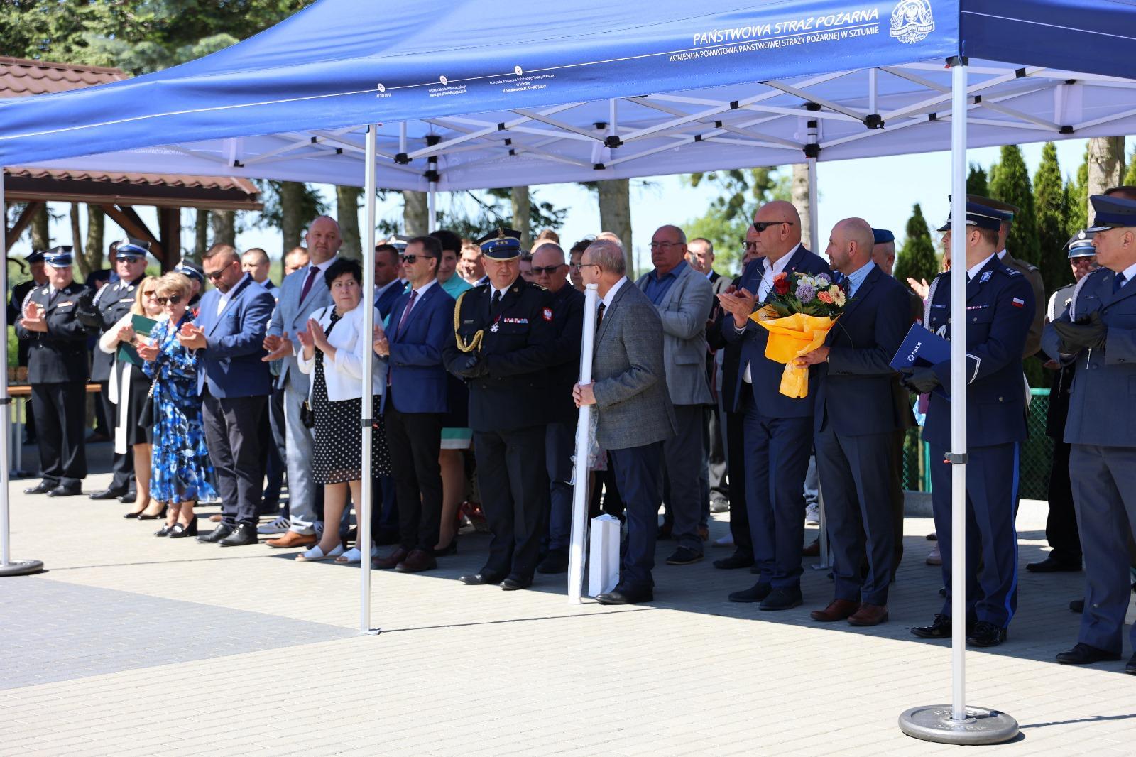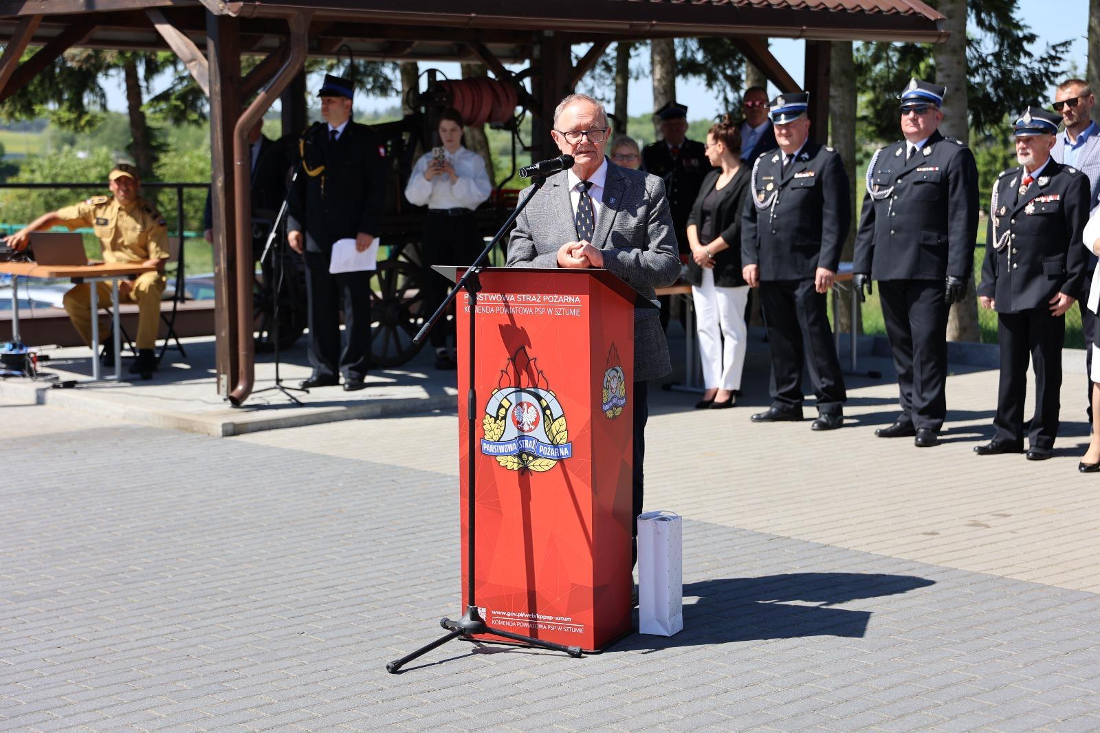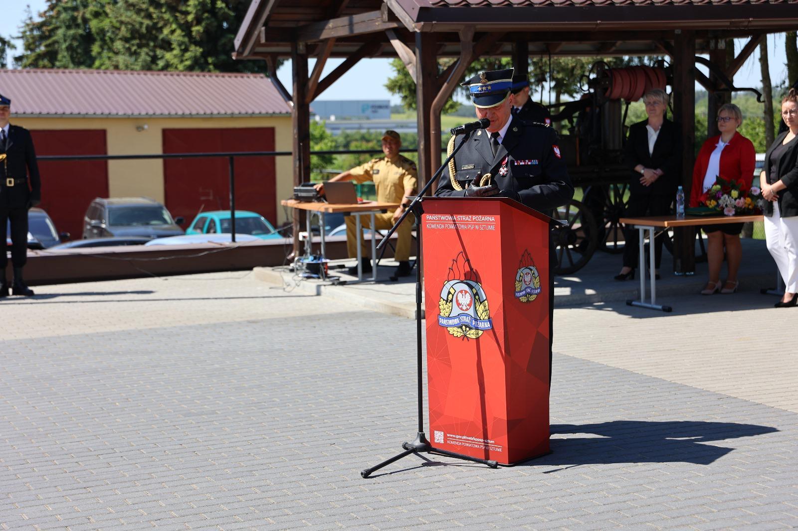 Po złożeniu przez dowódcę uroczystości meldunku Pomorskiemu Komendantowi Wojewódzkiemu st. bryg. Jackowi Niewęgłowskiemu, podniesieniu flagi państwowej oraz odśpiewaniu hymnu państwowego Komendant Powiatowy Państwowej Straży Pożarnej w Sztumie powitał przybyłych gości.