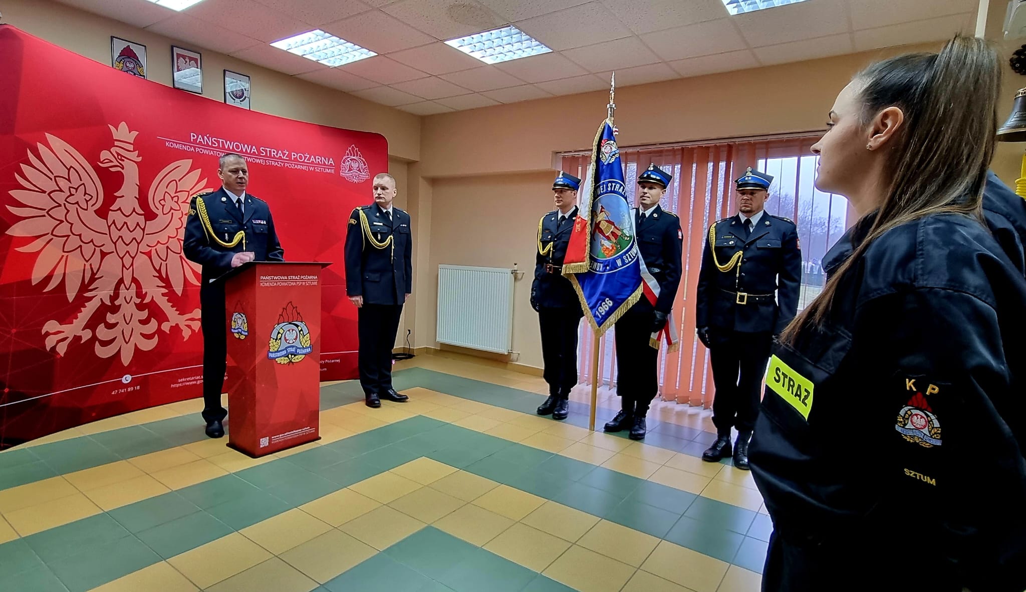 25 stycznia 2024 roku w Komendzie Powiatowej PSP w Sztumie odbyła się uroczysta zbiórka połączona ze ślubowaniem dwóch nowo przyjętych strażaków w szeregi Państwowej Straży Pożarnej.