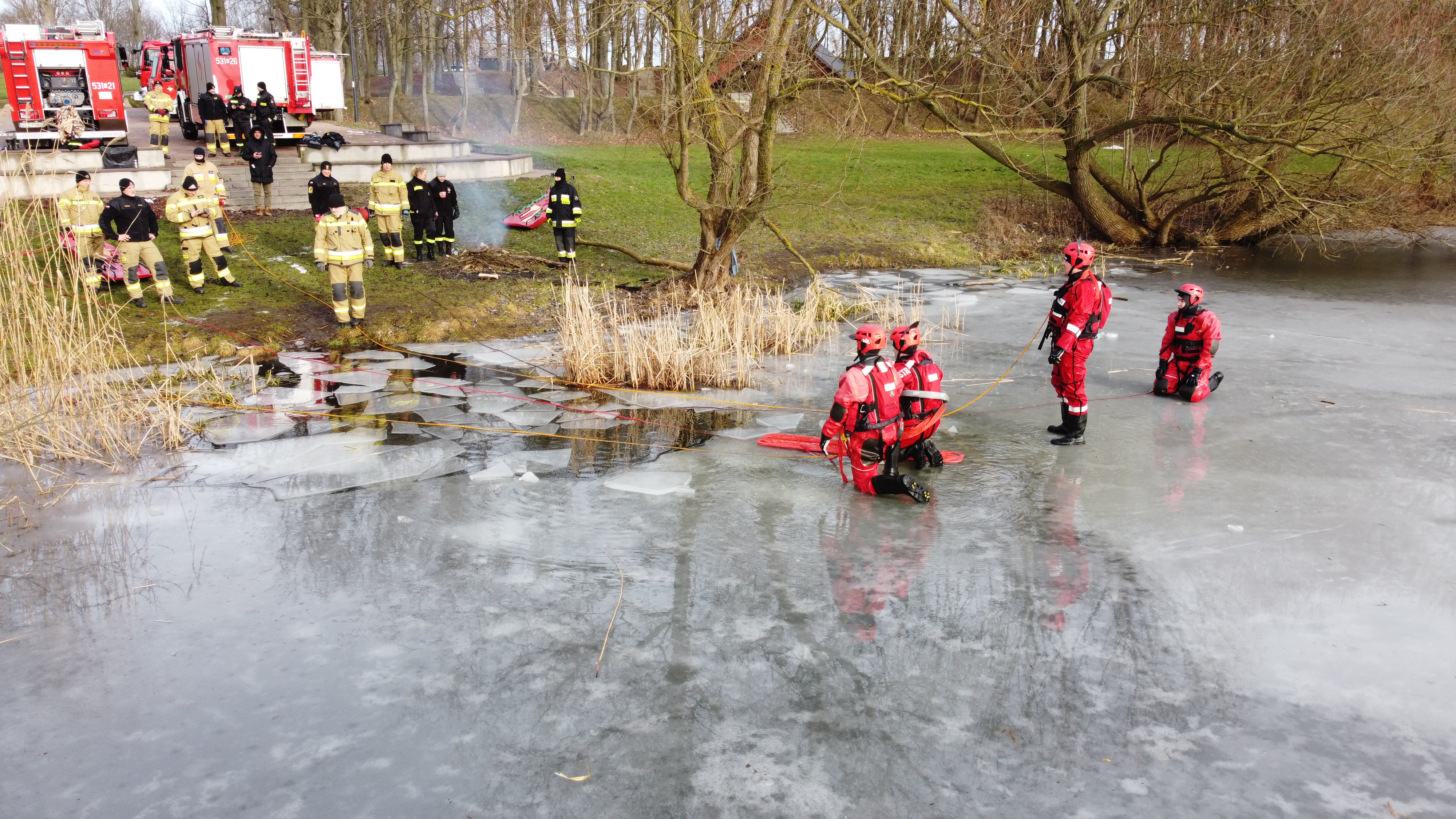 12 lutego 2023 roku nad jeziorem Barlewickim w Sztumie przeprowadzono szkolenie w zakresie ratownictwa lodowego. Sprzyjające warunki pogodowe pozwoliły doskonalić praktyczne umiejętności użycia sprzętu specjalistycznego służącego do ewakuacji osób poszkodowanych z zamarzniętych obszarów wodnych. W ćwiczeniach udział wzięli strażacy z Jednostki Ratowniczo-Gaśniczej PSP w Sztumie oraz druhowie z OSP Żuławka Sztumska, Mikołajki Pomorskie, Dąbrówka Malborska, Gościszewo, Bukowo.