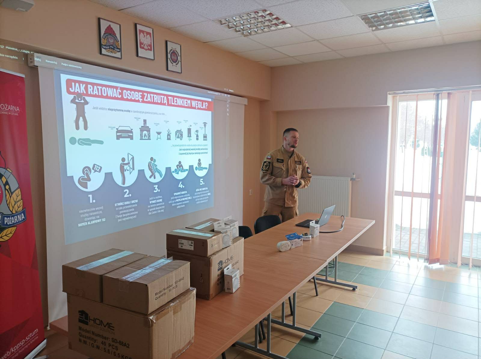 Podczas szkolenia funkcjonariusz Państwowej Straży Pożarnej omówił założenia programu oraz przedstawił zasady jego prawidłowej realizacji. Uczestnicy zapoznali się z zagrożeniami wynikającymi z obecności tlenku węgla w pomieszczeniach mieszkalnych, a także z praktycznymi aspektami montażu i obsługi czujek czadu.
