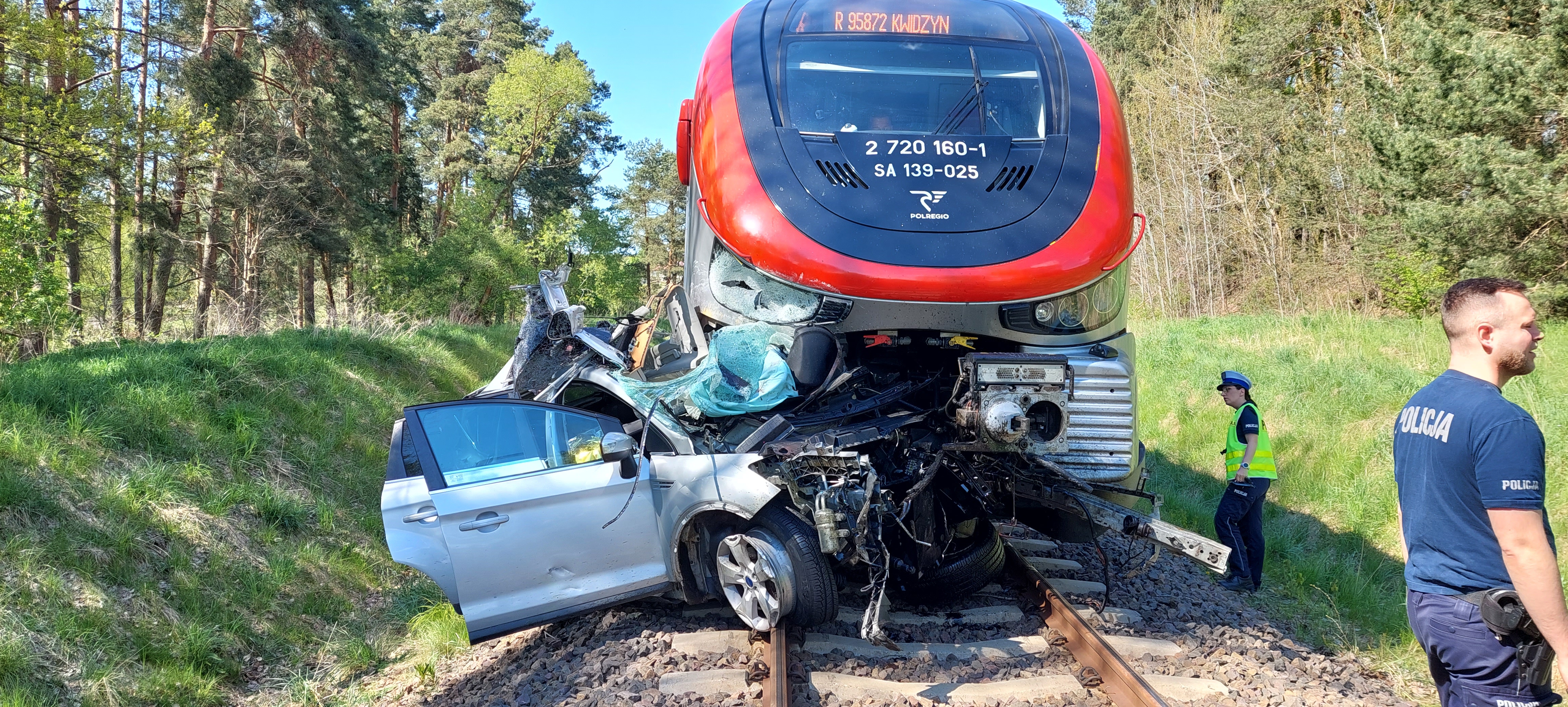 Dyżurny Stanowiska Kierowania Komendanta Powiatowego PSP w Sztumie, przyjął zgłoszenie o zderzeniu samochodu osobowego ze składem pociągu osobowego relacji Malbork - Sztum na przejeździe kolejowym w miejscowości Sztumskie Pole. Do zdarzenia zadysponowano trzy zastępy z KP PSP w Sztumie. Po przybyciu na miejcie zdarzenia uzyskano informacje, iż, pociągiem podróżowało 27 osób z których nikt nie wymagał pomocy medycznej. Samochodem osobowy podróżowała 50 letnia kierująca, która poniósła śmieć na miejscu. Działania PSP polegały na zabezpieczeniu miejsca zdarzenia, pomoc pasażerom w bezpiecznym przemieszczaniu się do podstawionego pojazdu zastępczego, wydobycie kierowcy z pojazdu przy uzyciu narzedzi hydraulicznych, usuniecie pojazdu z nasypu kolejowego. Na miejscu zdarzenia obecny był Zastępca Komendanta Powiatowego PSP w Sztumie.