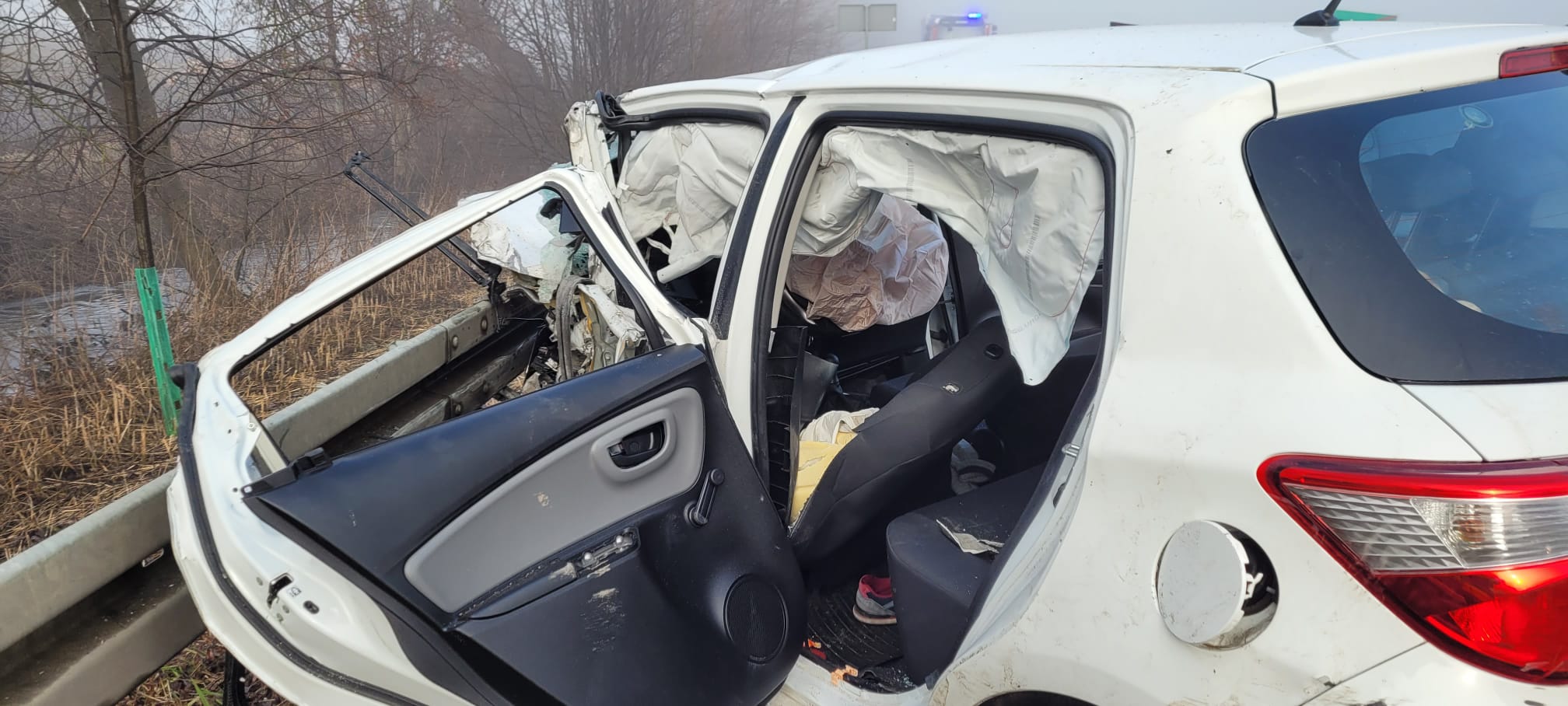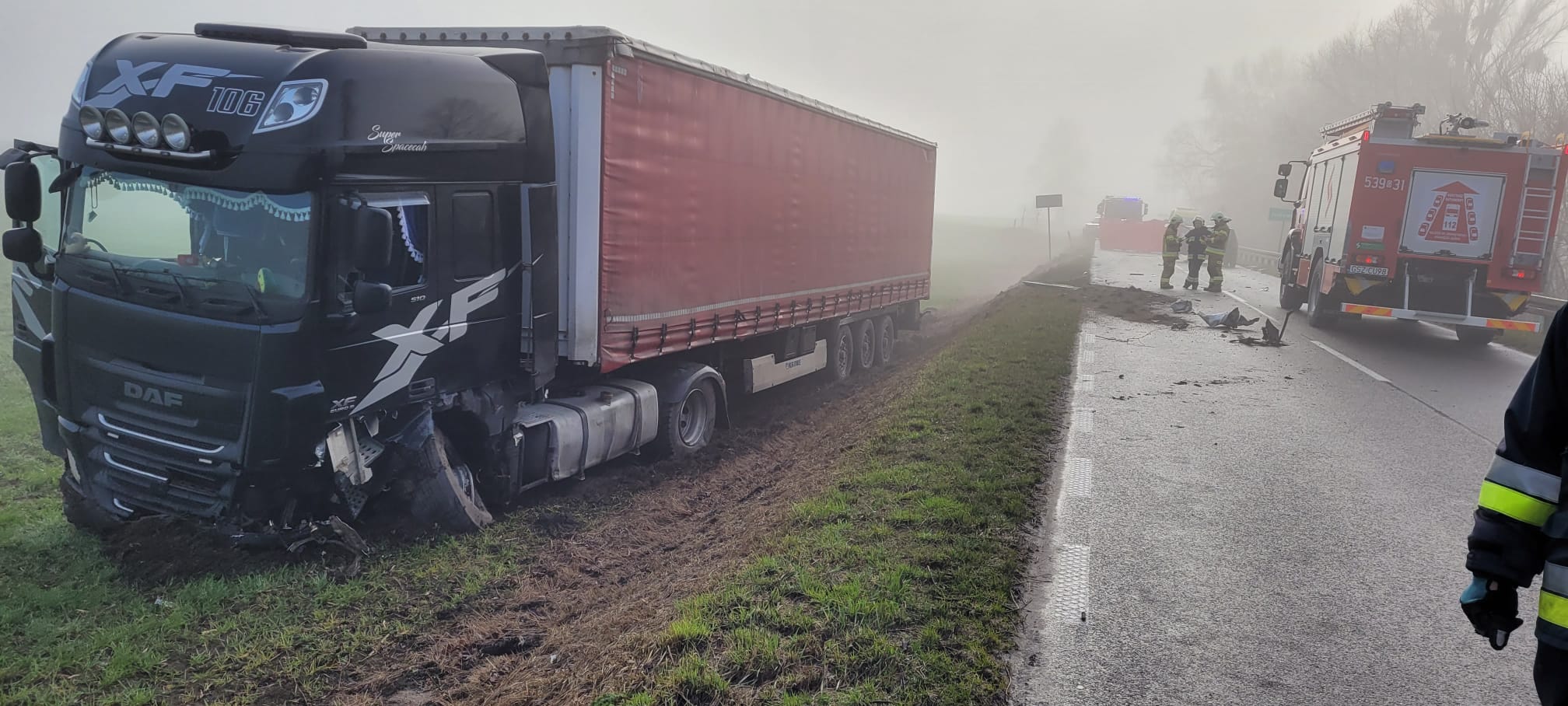 Po przybyciu na miejsce zdarzenia pierwszego zastępu straży pożarnej stwierdzono, że w wyniku wypadku samochód osobowy jest mocno uszkodzony, kierowca pojazdu zakleszczony w pojeździe bez oznak życia, kierowca pojazdu ciężarowego znajdującego się poza pasem ruchu bez obrażeń. Działania straży pożarnej w pierwszej kolejności polegały na zabezpieczeniu miejsca zdarzenia oraz udzielenia KPP poszkodowanemu kierowcy osobówki. Pomimo prowadzenia akcji resuscytacyjnej kierowca nie przeżył. Droga na czas działań była zablokowana.
