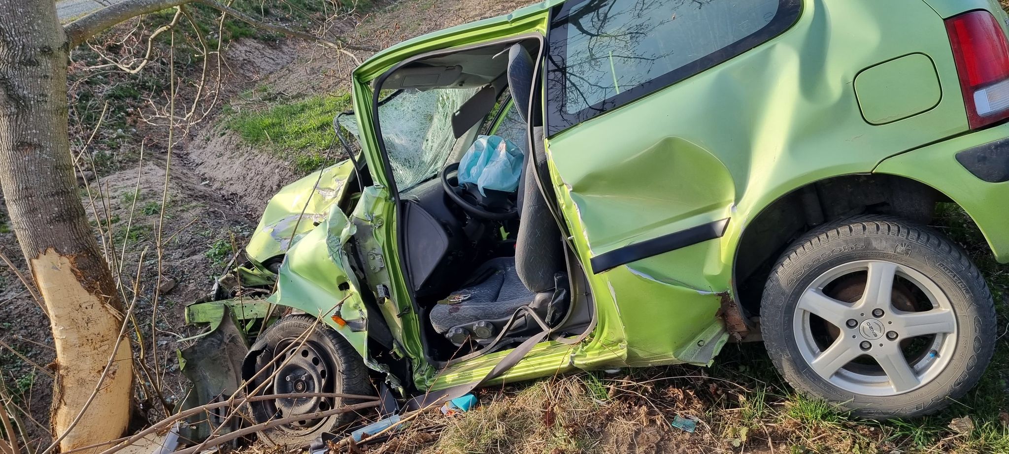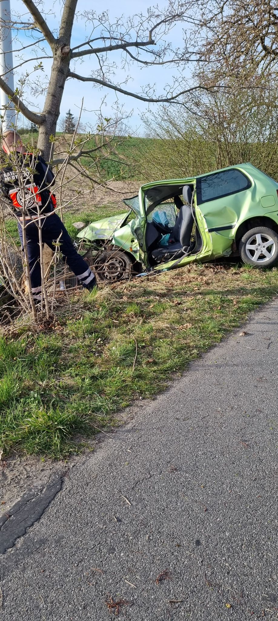 Po dojeździe zastępów zastano samochód osobowy marki Honda po uderzeniu w drzewo z trzema poszkodowanymi znajdującymi się w pojeździe.