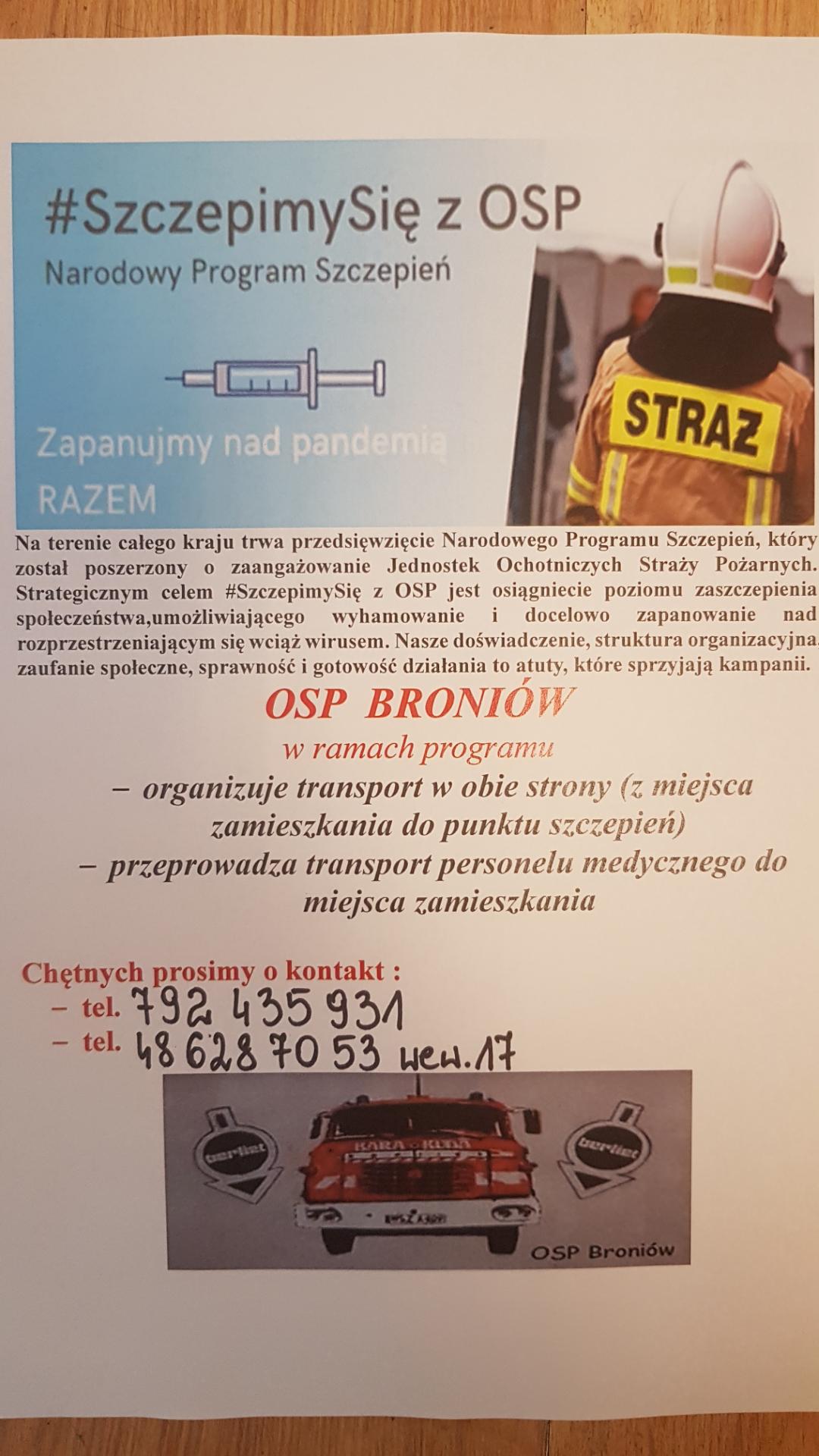 Dzięki dużemu zaangażowaniu druhów OSP Broniów którzy przy współpracy z Samodzielnym Zespołem Opieki Zdrowotnej w Szydłowcu utworzyli tymczasowy punkt szczepień z jednodawkowej szczepiomki przeciwko COVID-19 skorzystało 52 osoby.