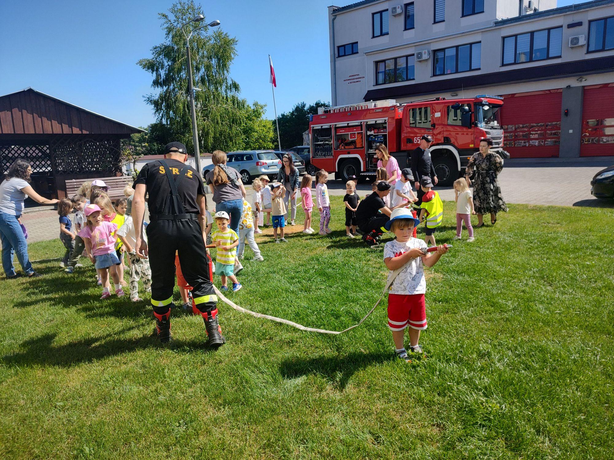 Największą atrakcją dla Przedszkolaków było jak zwykle lanie wody ze strażackich węży.