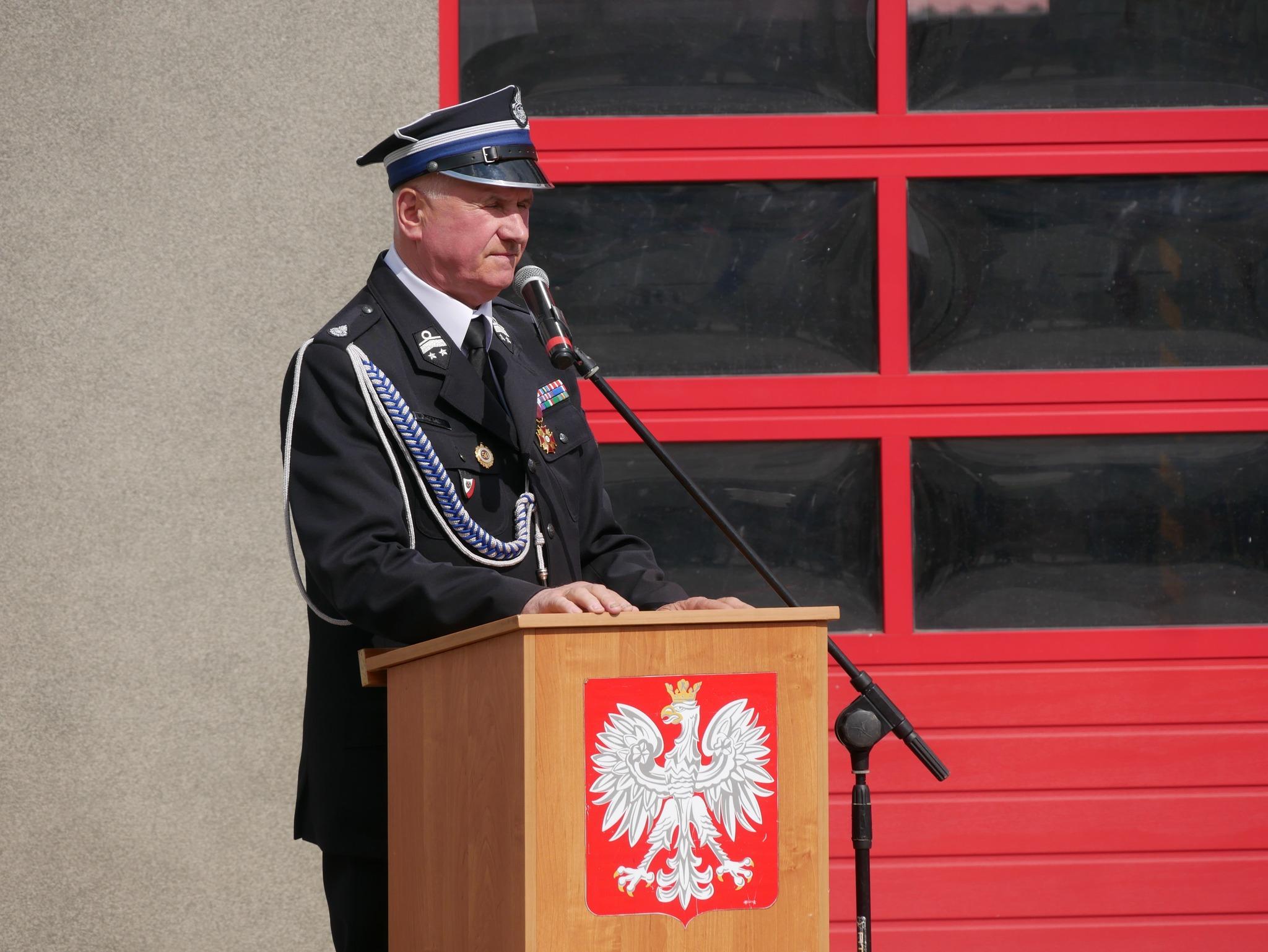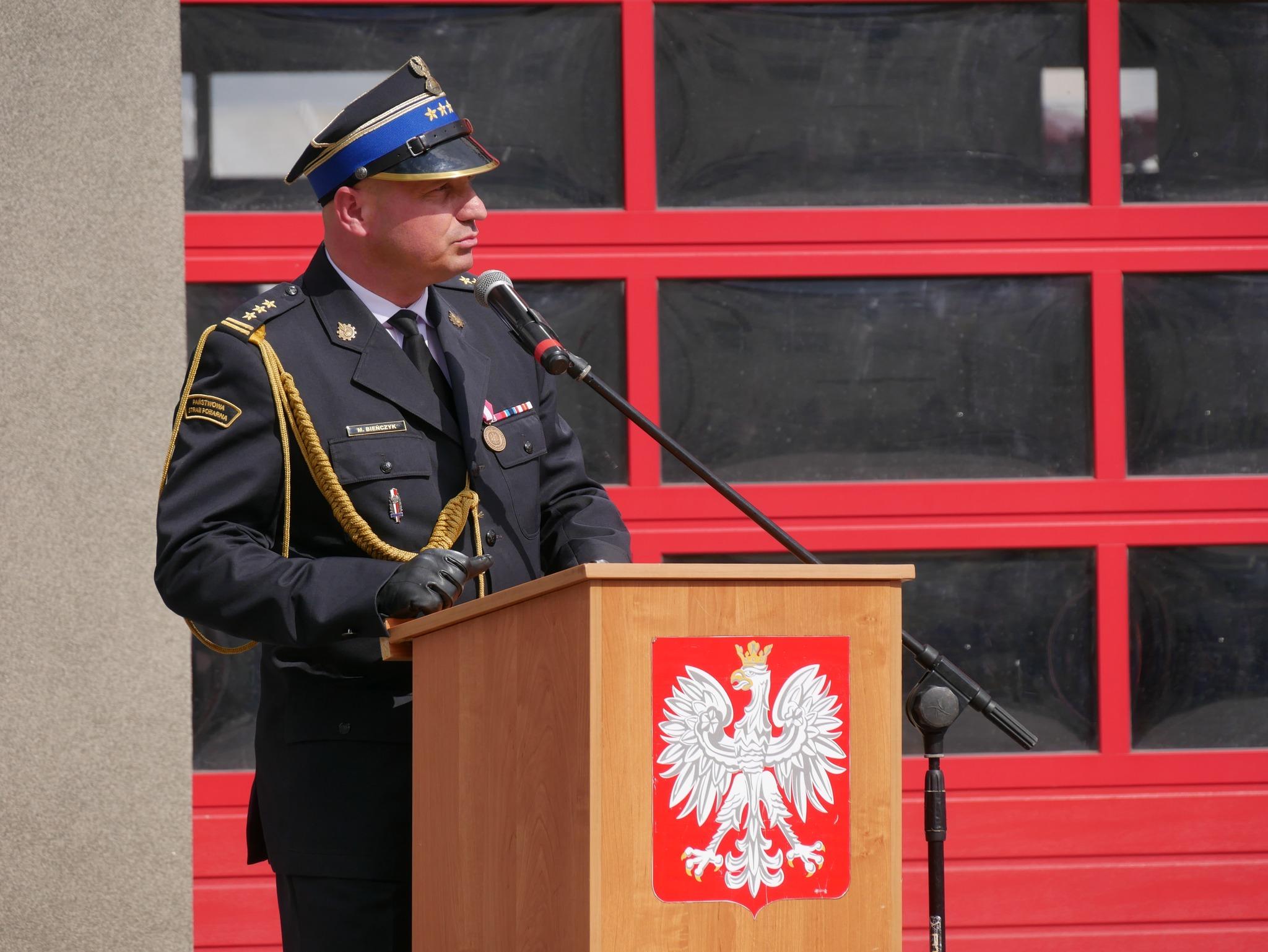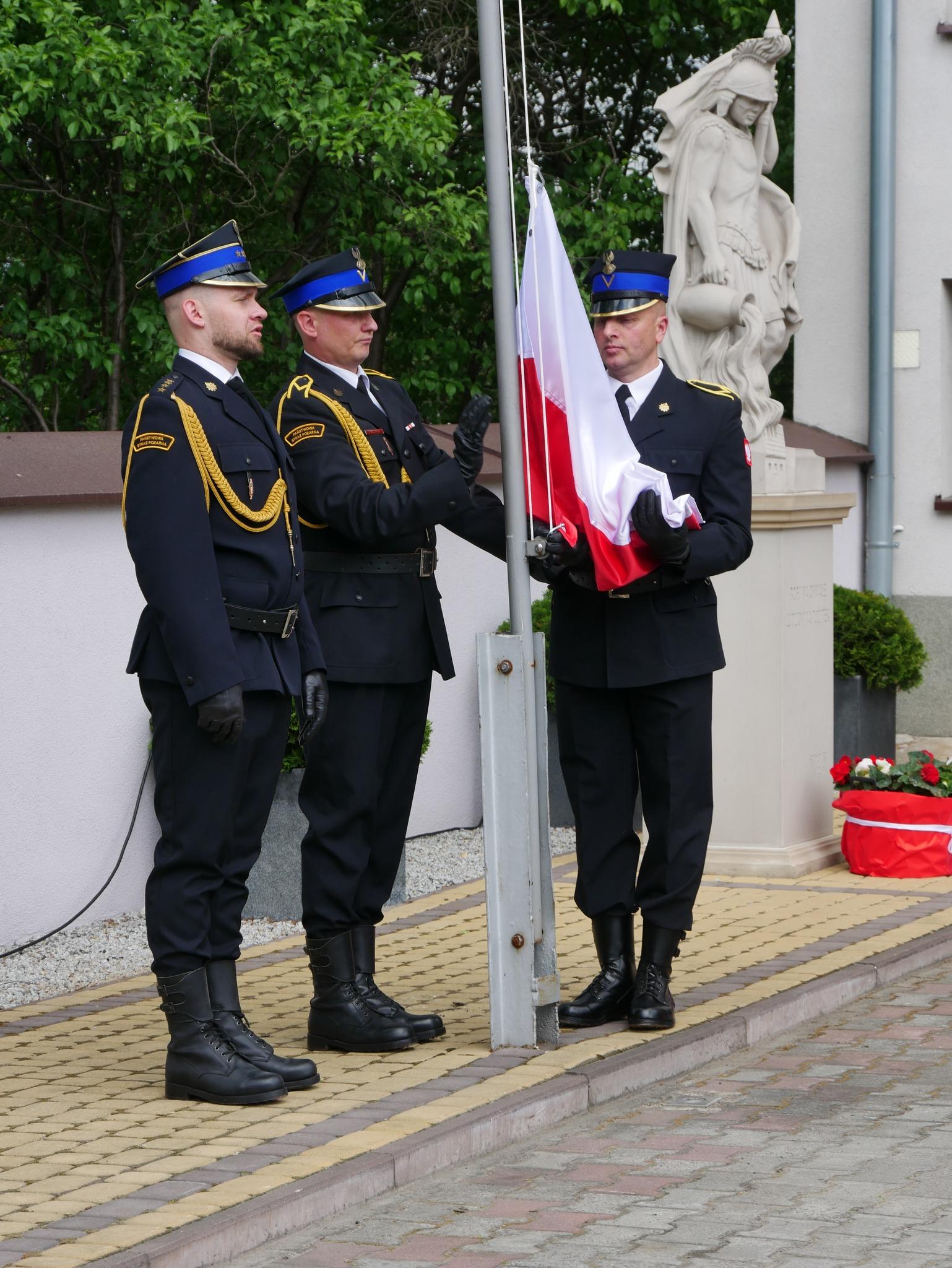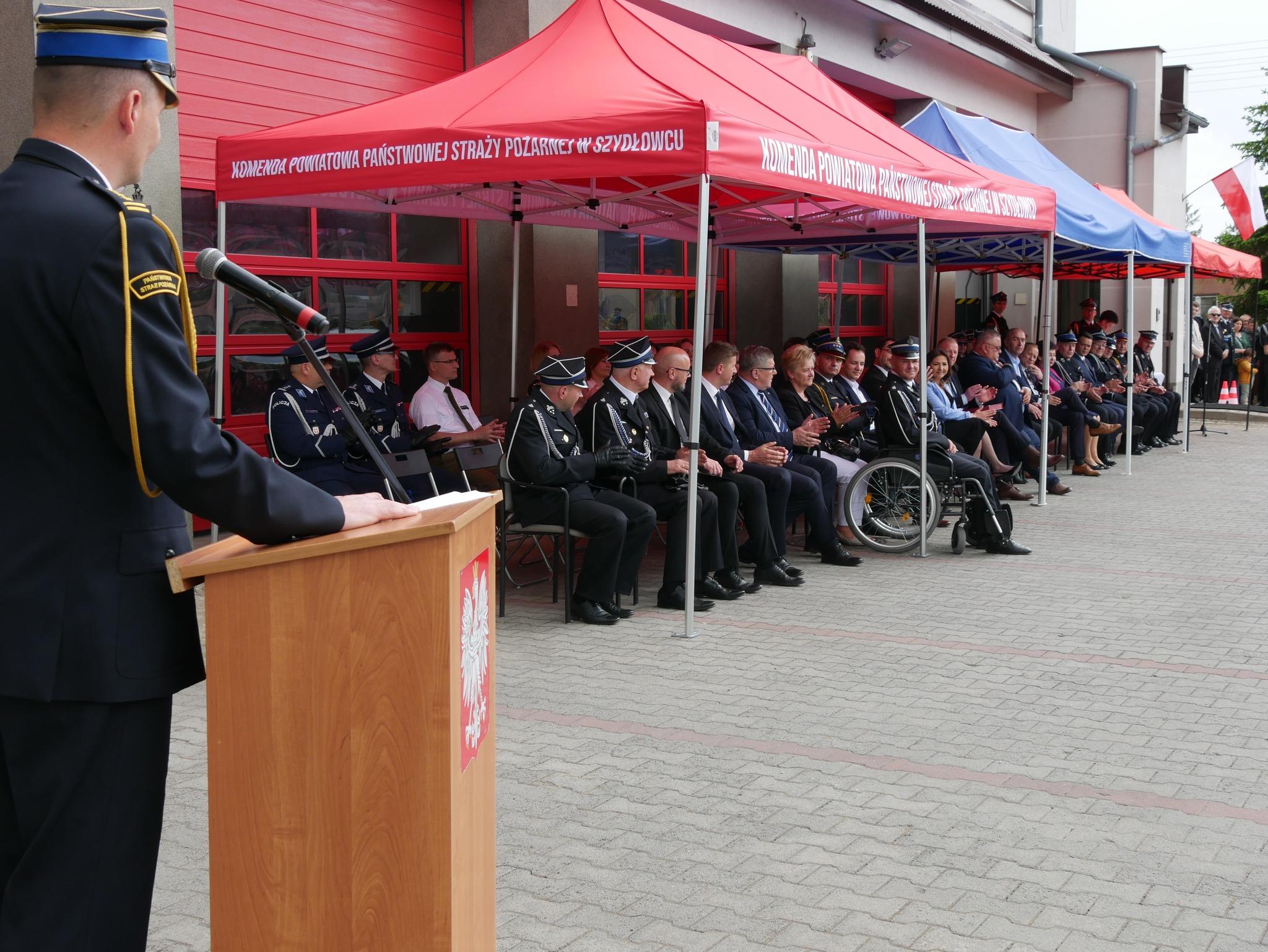 Po podniesieniu flagi państwowej i odegraniu Mazurka Dąbrowskiego, Komendant Powiatowy Państwowej Straży Pożarnej w Szydłowcu st. bryg. Paweł Sokół przywitał uczestników uroczystości oraz wygłosił okolicznościowe przemówienie.