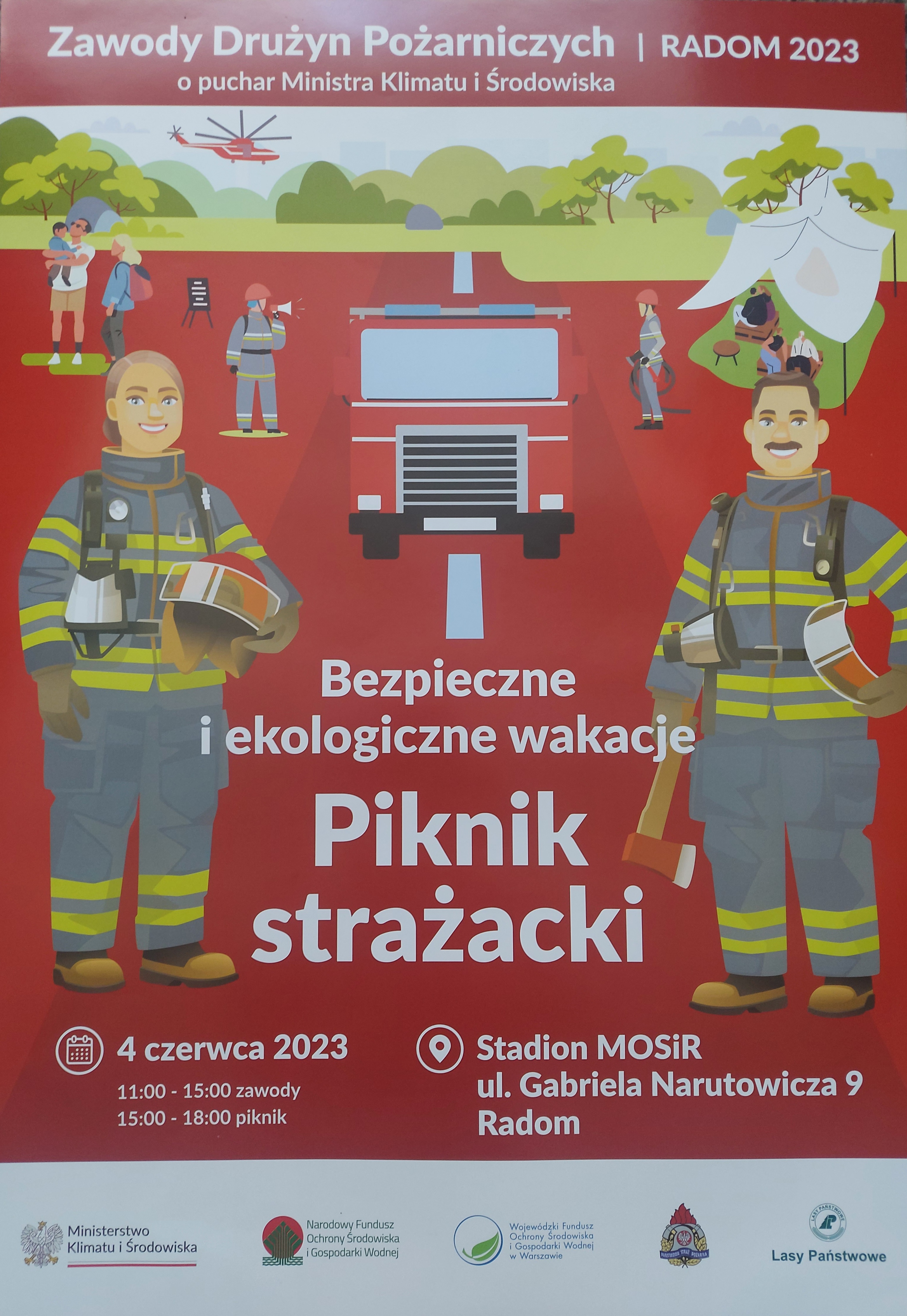 Dnia 04.06.2023 r. w Radomiu przy ul. Gabriela Narutowicza 9 odbędą się zawody żeńskich i męskich drużyn pożarniczych OSP Ziemi Radomskiej o puchar Ministra Klimatu i Środowiska oraz piknik strażacki "Bezpieczne i ekologiczne wakacje"