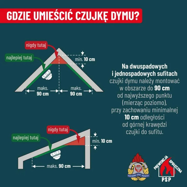 Najlepszym miejscem na montaż czujki dymu jest środek płaskiego sufitu. Na sufitach pochyłych (jednospadowych i dwuspadowych) trzeba montować czujki dymu w obszarze do 90 cm od najwyższego punktu (mierząc poziomo), przy zachowaniu minimalnej odległości (10 cm) od górnej krawędzi czujki do sufitu.