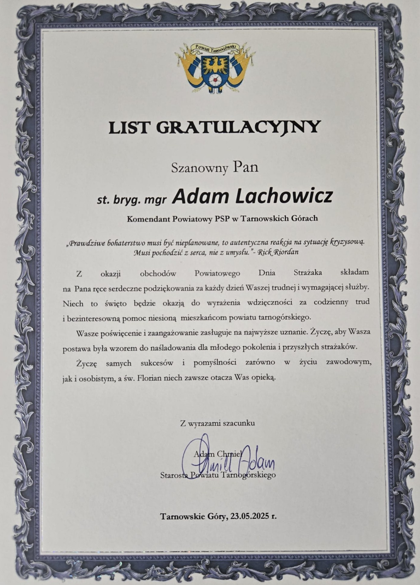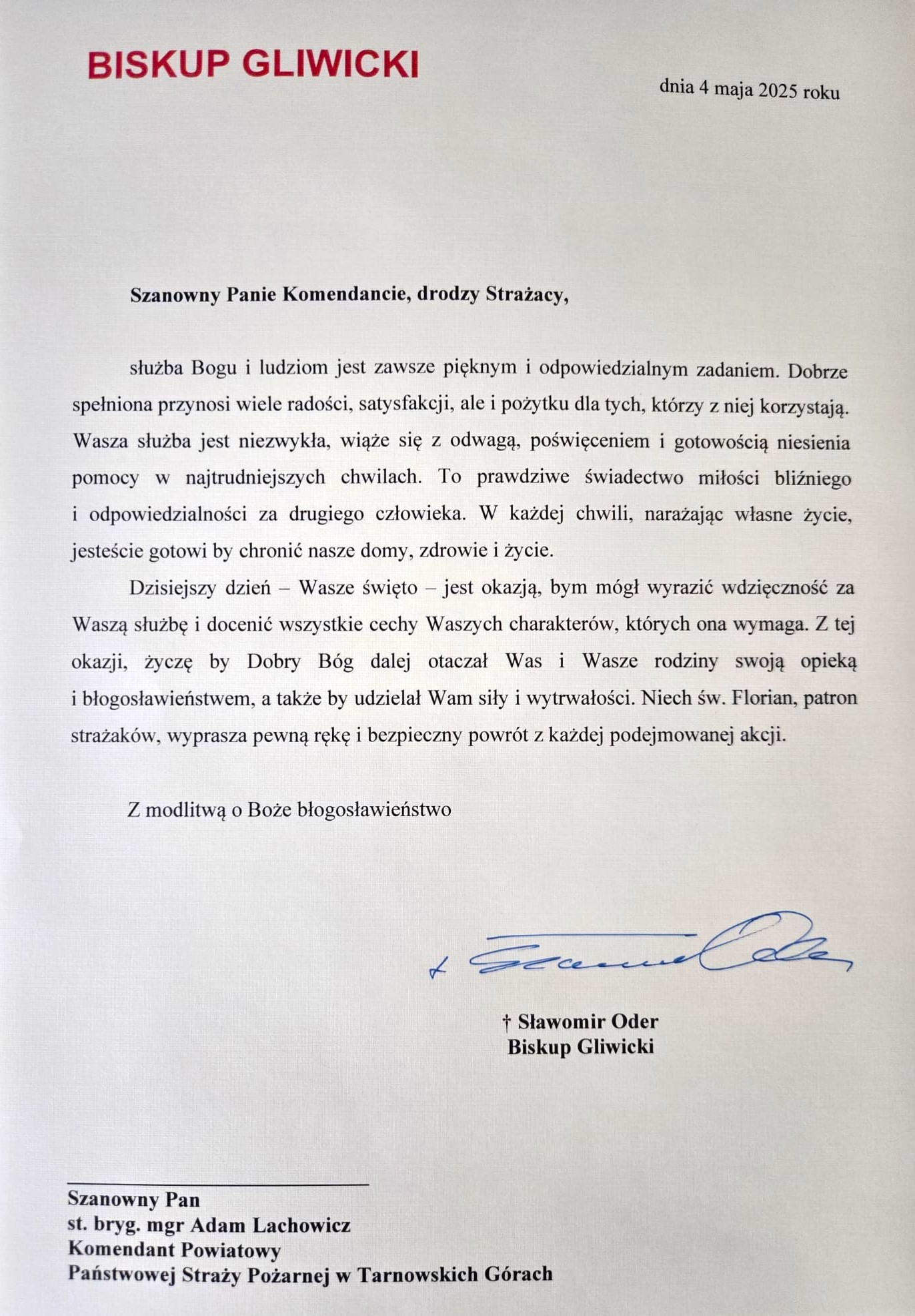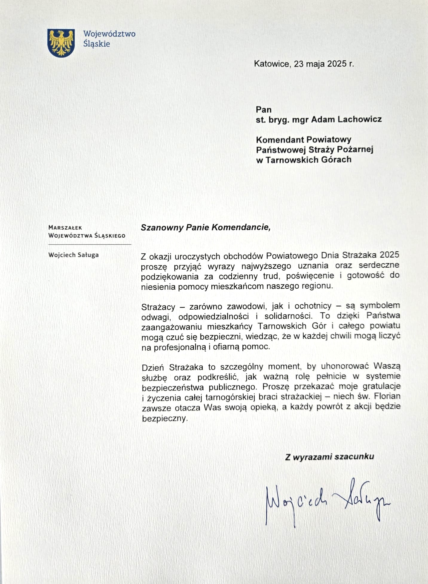 Z okazji naszego święta na ręce Komendanta Powiatowego Państwowej Straży Pożarnej w Tarnowskich Górach wpłynęły listy gratulacyjne oraz życzenia m. in. od Marszałka Województwa Śląskiego Pana Wojciecha Saługi, Starosty Powiatu Tarnogórskiego Pana Adama Chmiela oraz Biskupa Gliwickiego księdza Sławomira Oder.