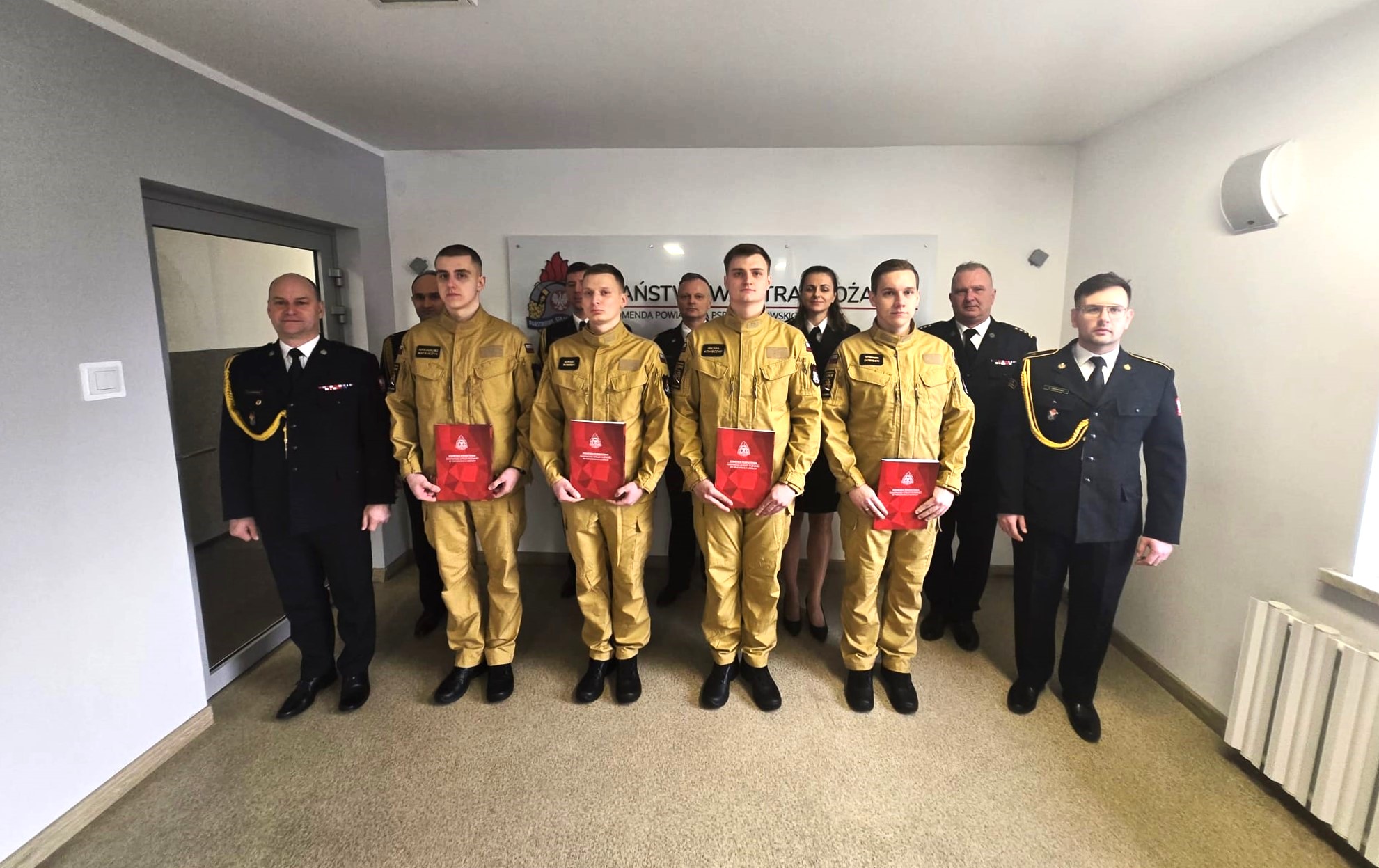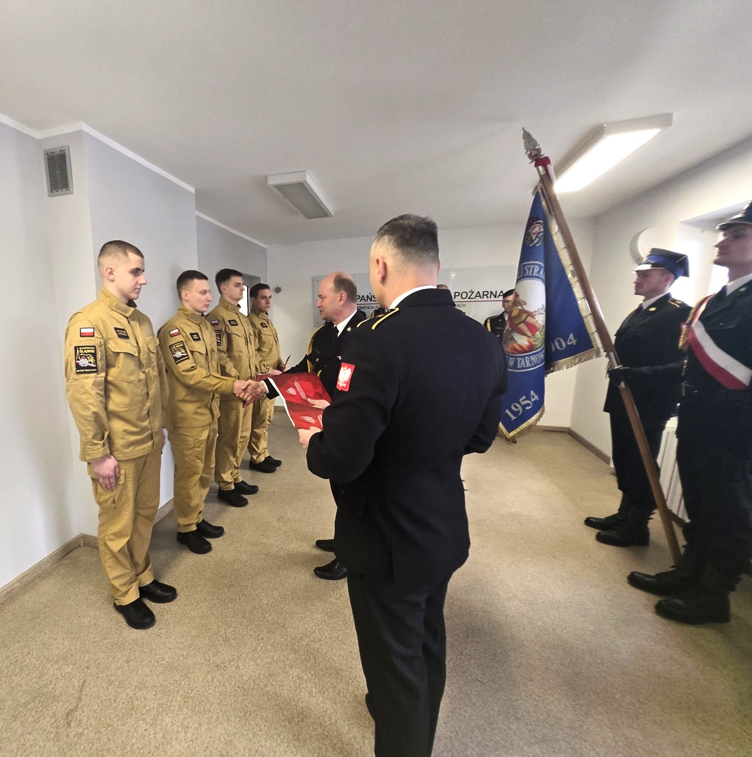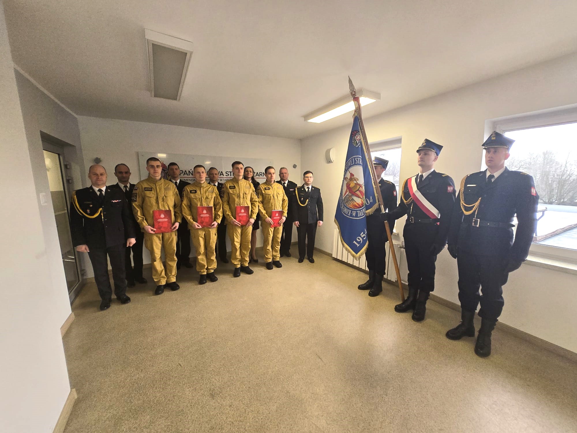 Ja, obywatel Rzeczypospolitej Polskiej, świadom podejmowanych obowiązków strażaka, uroczyście ślubuję być ofiarnym i mężnym w ratowaniu zagrożonego życia ludzkiego i wszelkiego mienia - nawet z narażeniem życia. Wykonując powierzone mi zadania, ślubuję przestrzegać prawa, dyscypliny służbowej oraz wykonywać polecenia przełożonych. Ślubuję strzec tajemnic związanych ze służbą, a także honoru, godności i dobrego imienia służby oraz przestrzegać zasad etyki zawodowej." - te słowo roty ślubowania w dniu 23.01.2025 roku wypowiedzieli nowi funkcjonariusze z Komendy Powiatowej Państwowej Straży Pożarnej w Tarnowskich Gorach.