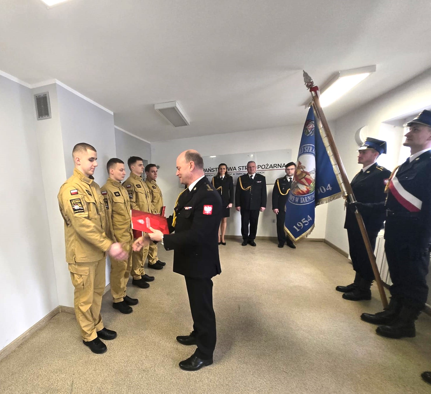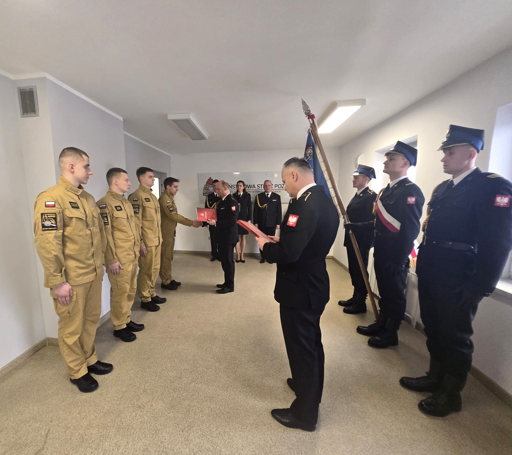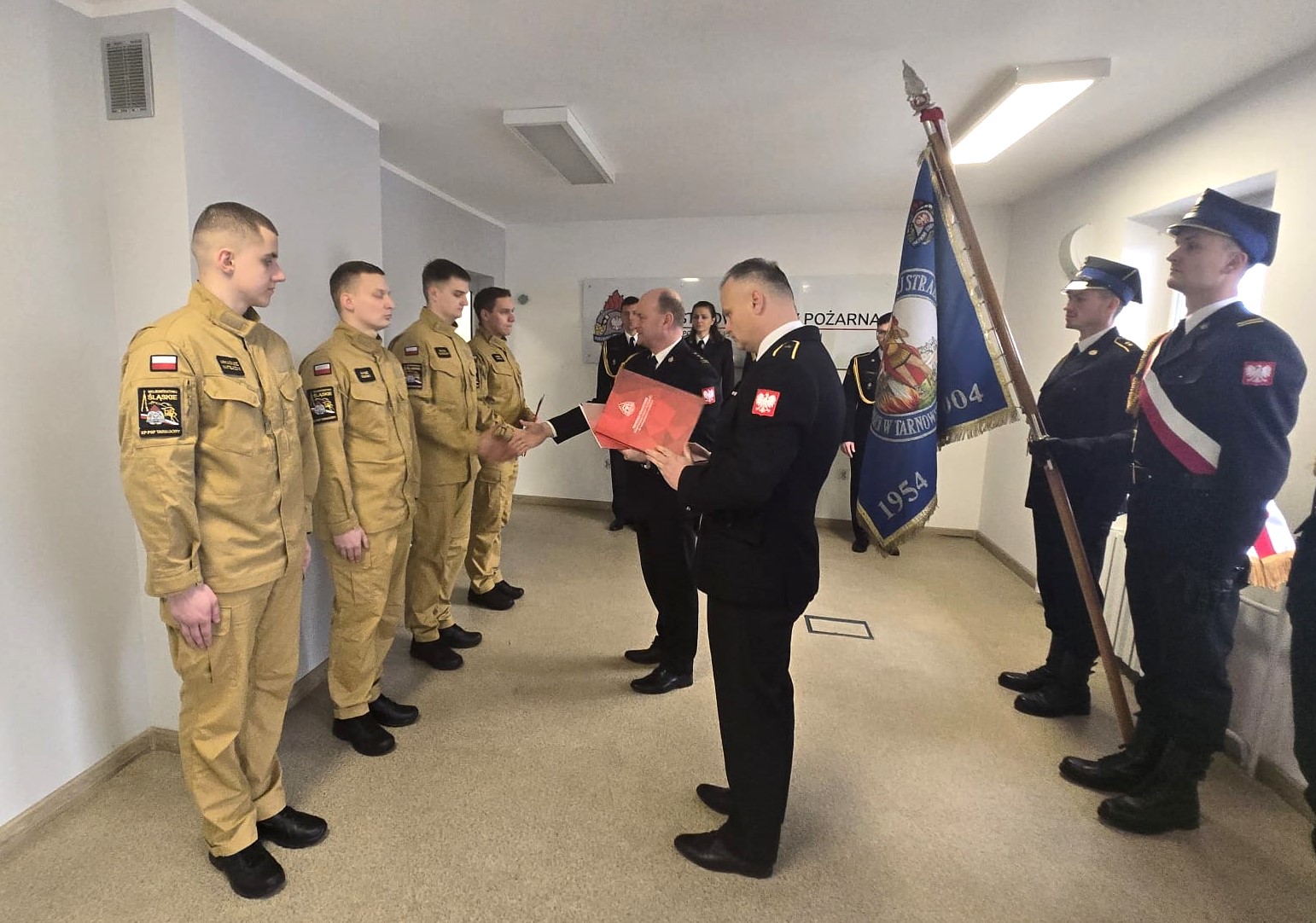 Podczas uroczystej zbiórki pod dowództwem mł. bryg. Dariusza Derejczyka, w obecności Zastępcy Komendanta Powiatowego PSP w Tarnowskich Górach st. bryg. Grzegorza Twardawy, kadry kierowniczej ślubowanie złożyli: