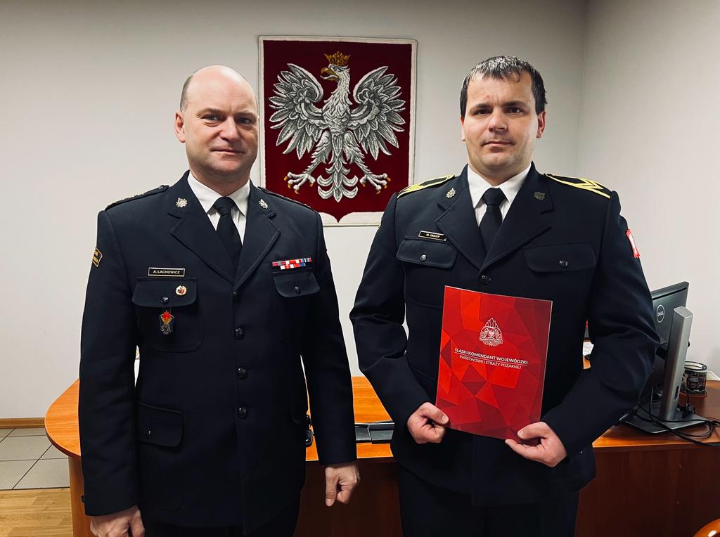 Komendant Powiatowy Państwowej Straży Pożarnej w Tarnowskich Górach st. bryg. Adam Lachowicz wręczył funkcjonariuszowi st. ogn. Martin Imach list gratulacyjny Komendanta Wojewódzkiego oraz nagrodę Komendanta Powiatowego.