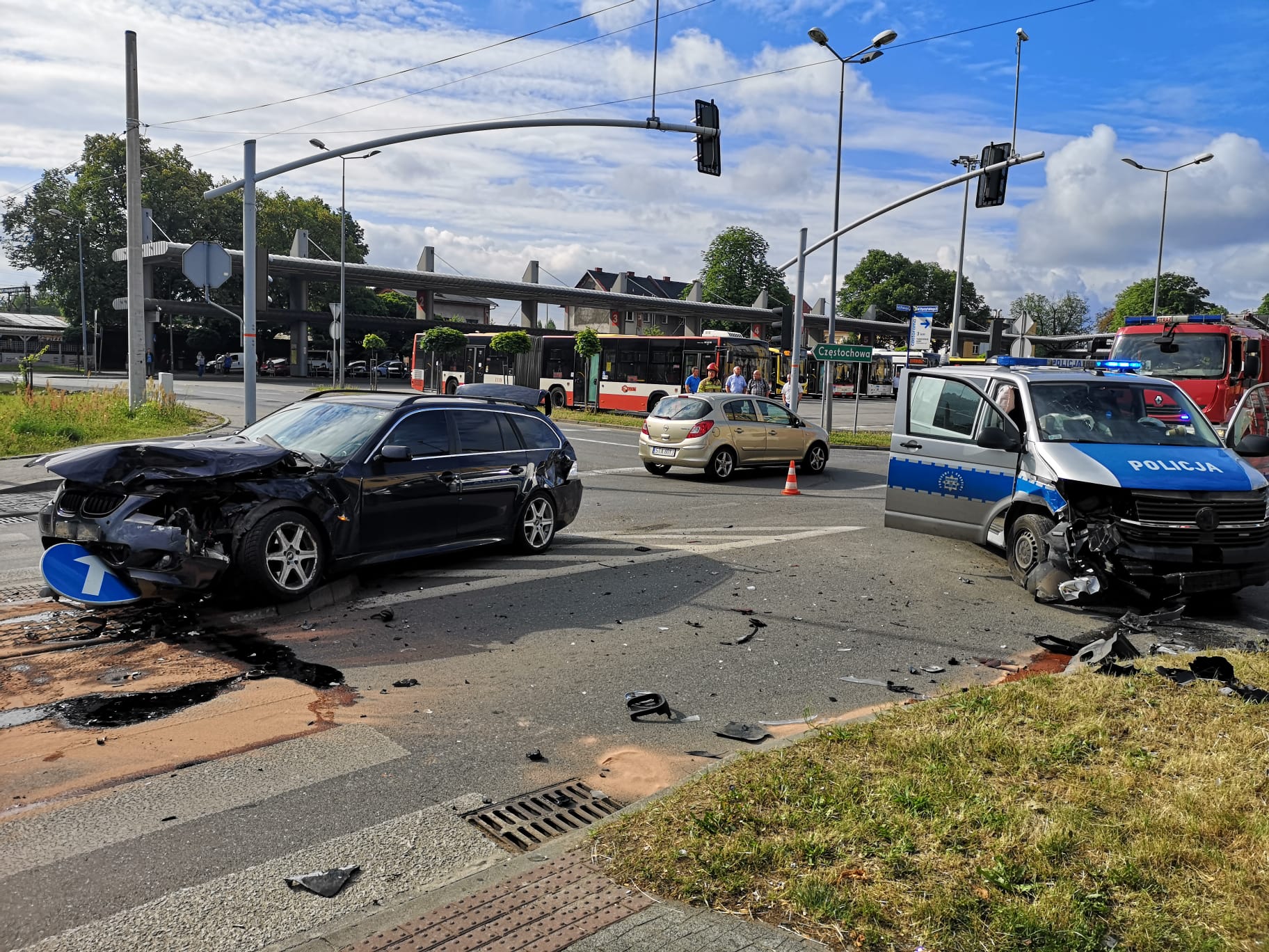 W dniu dzisiejszym o godzinie 08:16 Stanowisko Kierowania Komendanta Powiatowego otrzymało zgłoszenie o zderzeniu się samochodu osobowego z radiowozem w Tarnowskich Górach na skrzyżowaniu ul. Pokoju z ul. Styczyńskiego. Łącznie pojazdami podróżowało 5 osób. Dwie z nich zostały zabrane przez ZRM do szpitala.