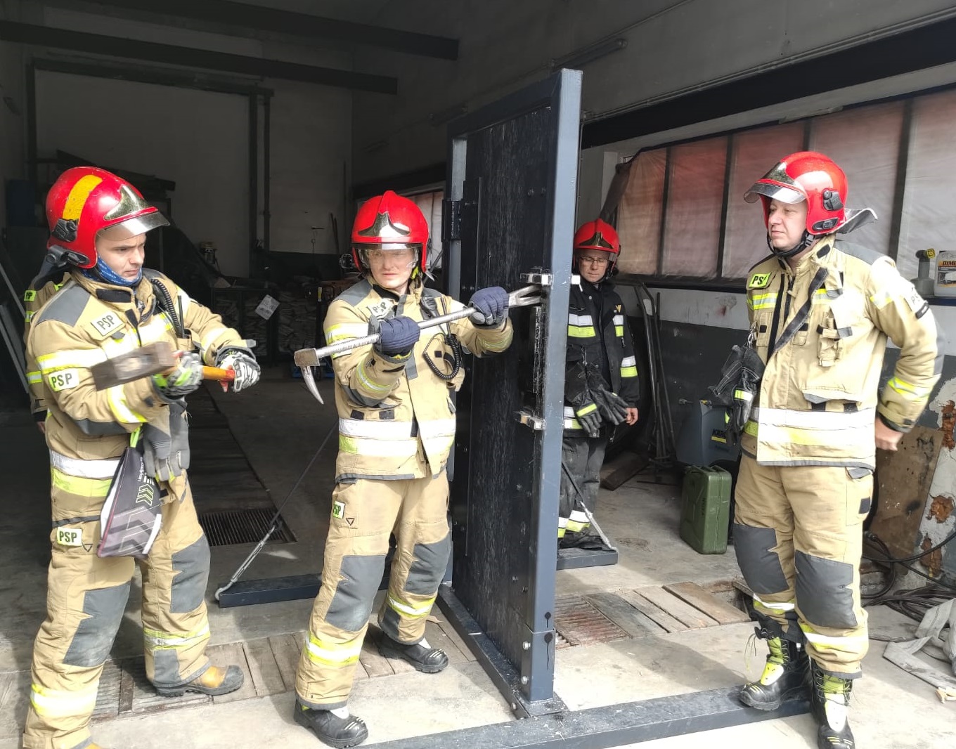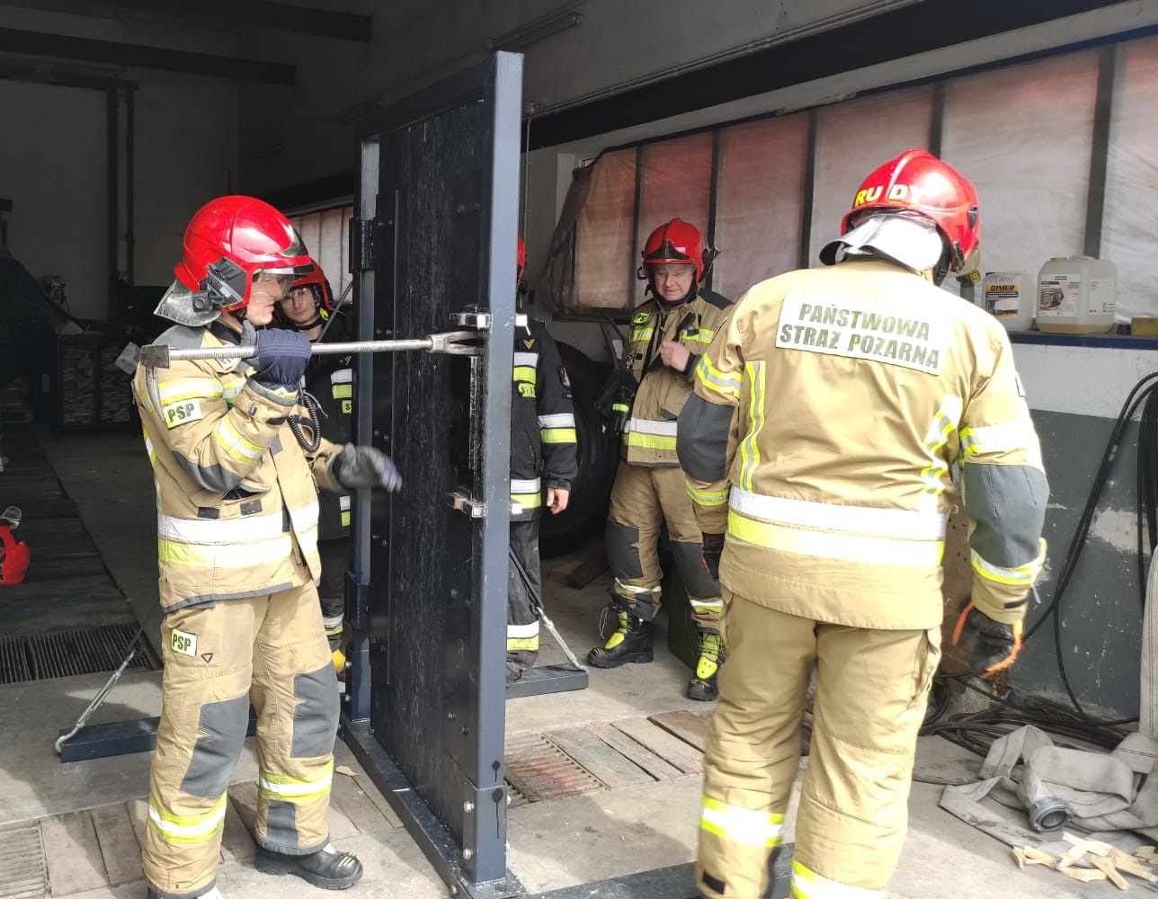 Szkolenia praktyczne dla strażaków z wykorzystaniem trenażera siłowego otwierania drzwi oraz paneli fotowoltaicznych