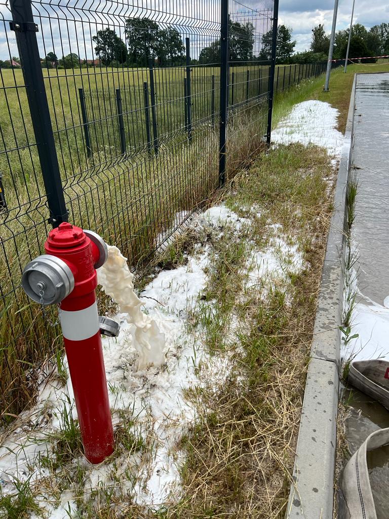 W dniach 21 - 23 czerwca 2022 roku odbyły się ćwiczenia na terenie Zakładu Guotai-Huarong Poland ul. Poznańska 2 w Prusicach, w których udział wzięły zastępy z JRG Trzebnica, SGRChem-eko z JRG 3 Wrocław oraz OSP Prusice. Pierwszy etap ćwiczeń przewidywał zapoznanie się obiektami, instalacjami technicznymi, z zabezpieczeniami przeciwpożarowymi oraz zagrożeniami wynikającymi z procesu technologicznego. W ramach wspólnego szkolenia zastępy przećwiczyły działania ratownicze przewidziane w jednym ze scenariuszy Wewnętrznego Planu Ratowniczego Zakładu. Założono rozszczelnienie zbiornika z cieczą łatwopalną, co skutkowało zapaleniem się substancji w ,,tacy wychwytowej”.