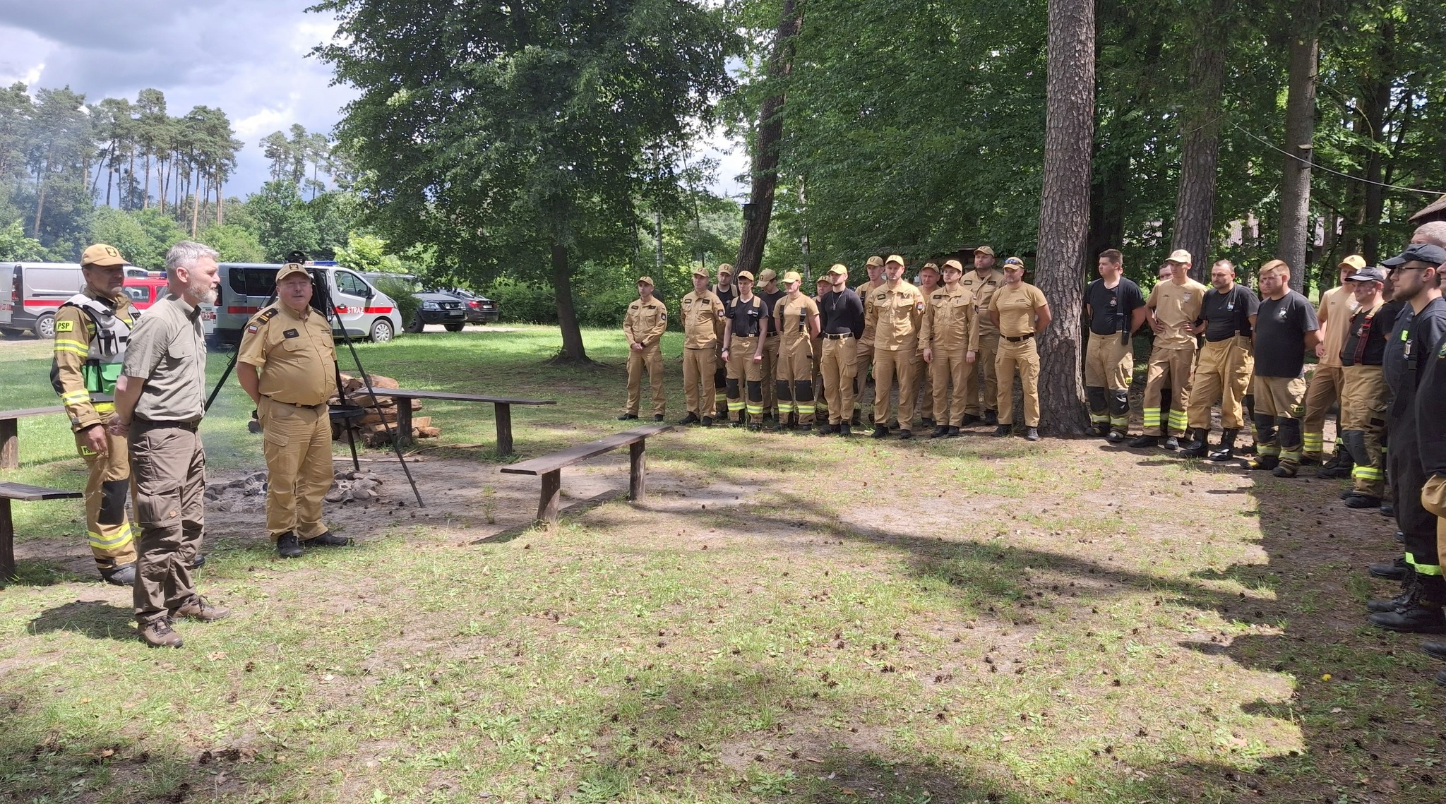 Przyjęty scenariusz ćwiczeń: W okolicach szkółki leśnej w Jarach zaobserwowano zadymienie nad kompleksem leśnym. Po przybyciu na miejsce przedstawiciela Nadleśnictwa potwierdzono pożar w obrębie młodnika sosnowego. Ze względu na silne zwarcie drzew oraz nisko osadzone korony ogień rozprzestrzeniał się błyskawicznie. Dodatkowo dynamikę pożaru potęgowały niekorzystne warunki atmosferyczne – wysoka temperatura, okres suszy oraz wzmagające się podmuchy. W tej sytuacji pożar szybko rozprzestrzeniał się w kierunku sąsiadujących oddziałów leśnych, stwarzając realne zagrożenie dla zabudowań w m. Nowosielce.