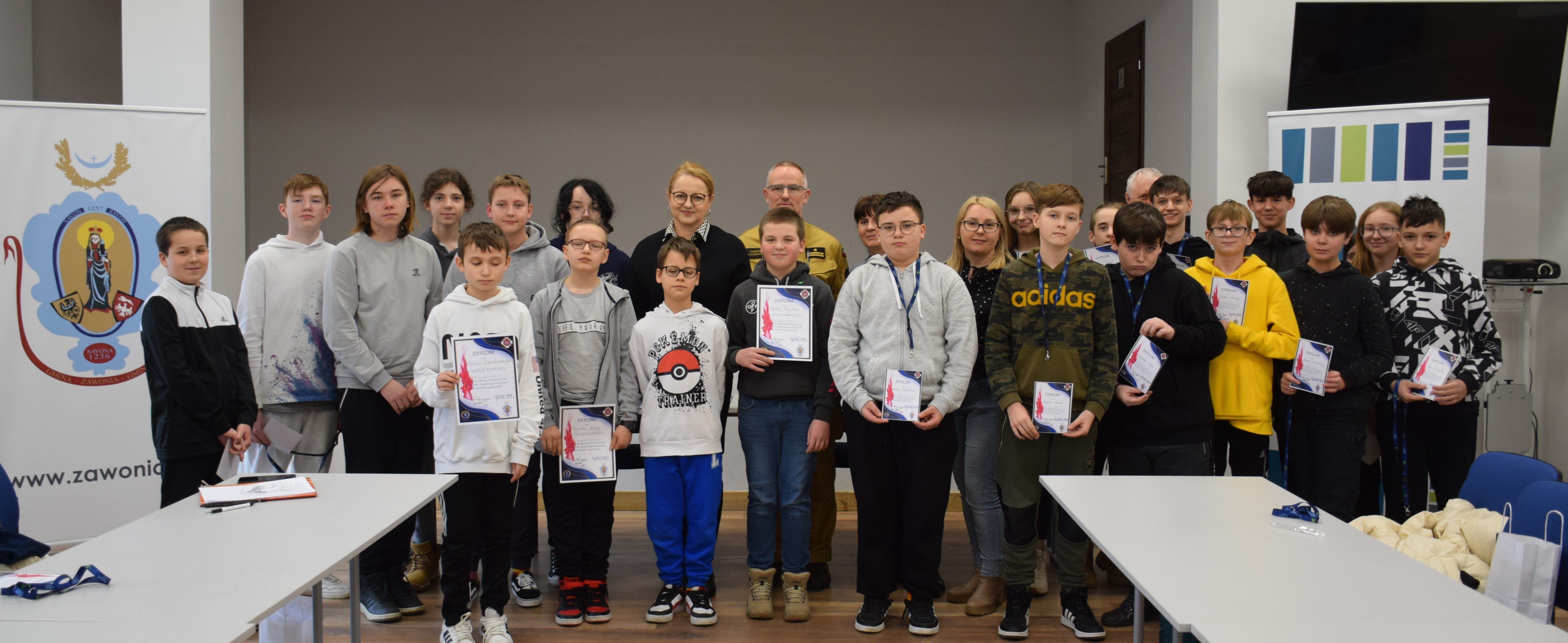 W dniu 13 marca 2023 roku w Sali Senioralnej przy UG w Zawoni odbył się Ogólnopolski Turniej Wiedzy Pożarniczej poziomu gminnego. Wójt Gminy p. Agnieszka Wersta przywitała uczestników - tym razem uczniów tylko starszych klas Zespołu Szkolno – Przedszkolnego w Zawoni, którzy mieli odwagę stanąć do trudnego zadania, jakim jest rozwiązanie testu przygotowanego przez KP PSP w Trzebnicy. Wyrównany poziom sprawił, że do wyłonienia wszystkich osób, które będą reprezentowały Gminę Zawonia na Powiatowym Turnieju Wiedzy Pożarniczej w Trzebnicy, komisja egzaminacyjna została zmuszona do przeprowadzenia dogrywki.