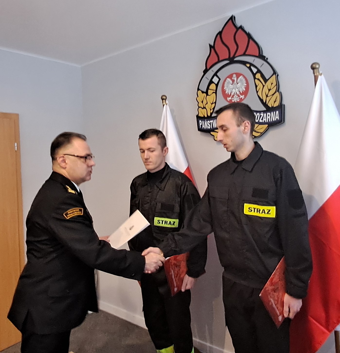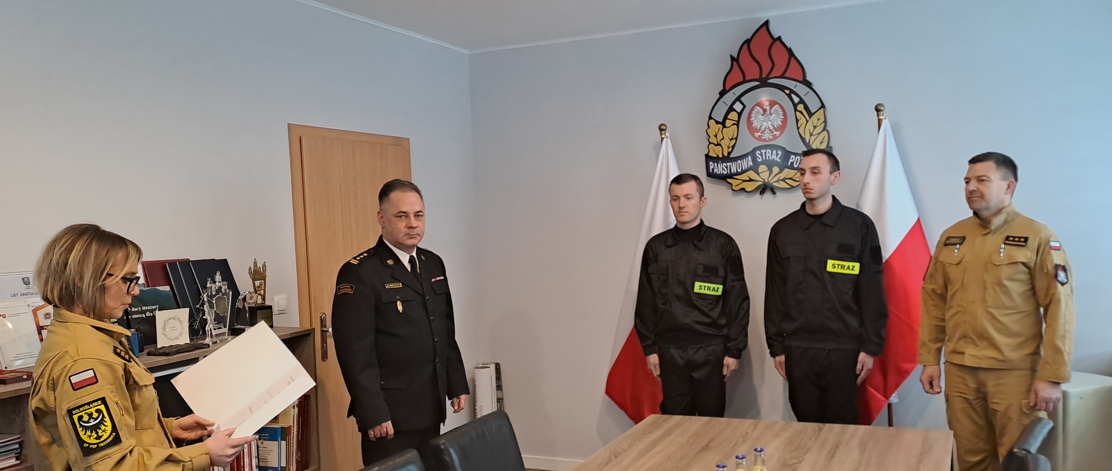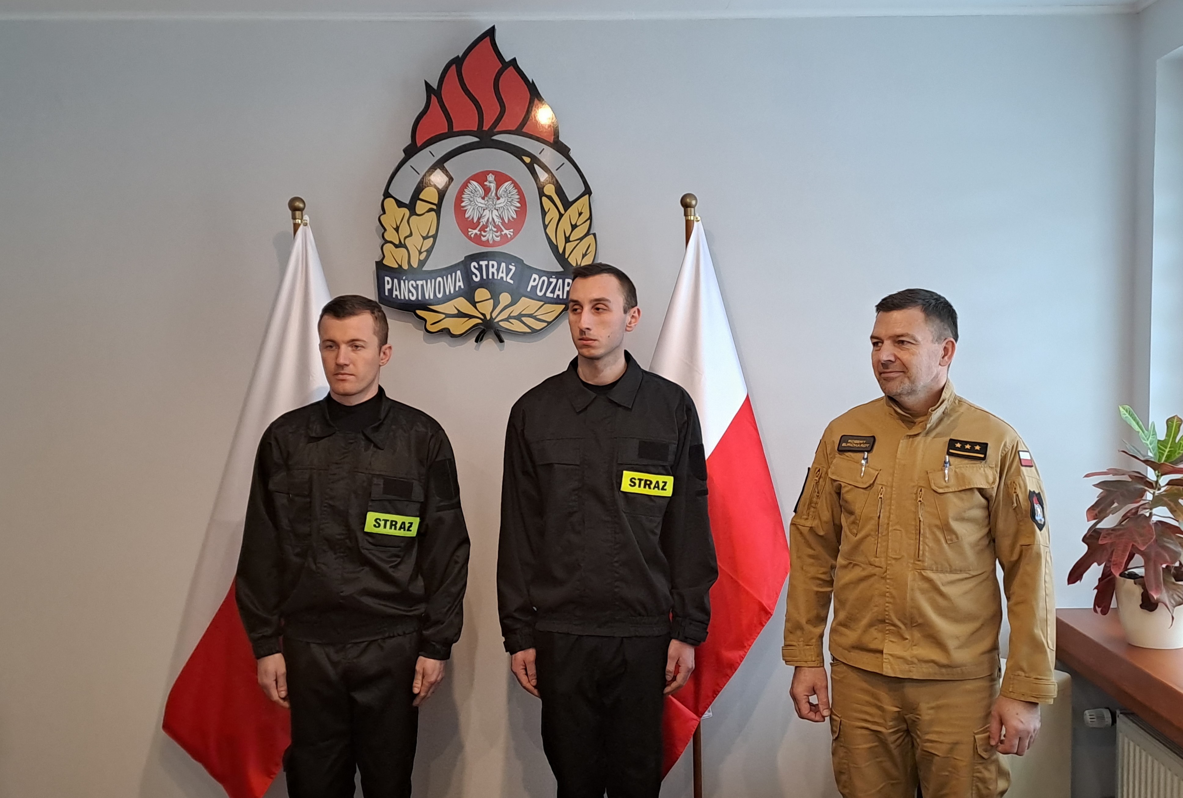 Z dniem 15 stycznia 2024 roku powitaliśmy w szeregach Państwowej Straży Pożarnej dwóch nowych strażaków: str. Dominika Sierszulskiego oraz str. Jakuba Dudę. Obaj Panowie zakończyli postępowanie kwalifikacyjne z wynikiem pozytywnym. Przed nimi wiele wyzwań i zadań. Zanim będą mogli w pełni podjąć służbę, muszą w pierwszej kolejności ukończyć szkolenie podstawowe w zawodzie strażak, które rozpoczną w najbliższym czasie.