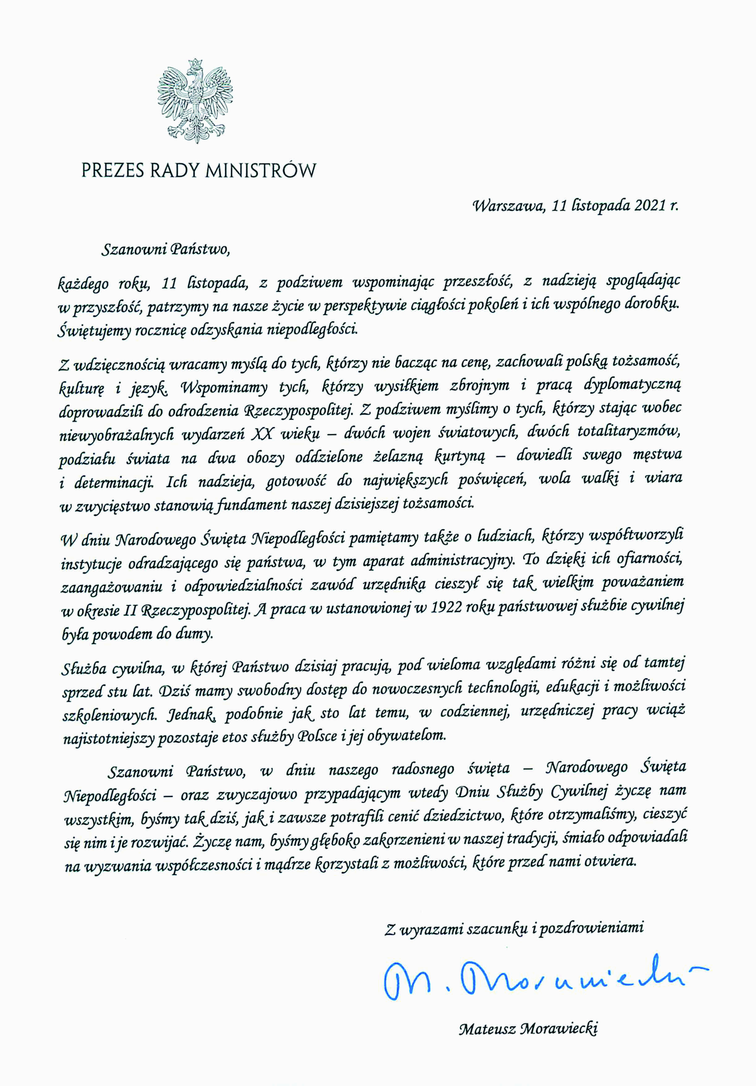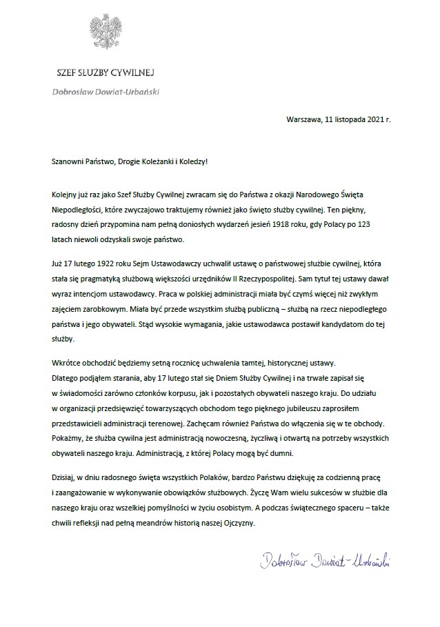 11 listopada oprócz Narodowego Święta Niepodległości jest również Dniem Służby Cywilnej. Z tego względu listy do członków korpusu służby cywilnej wystosowali prezes Rady Ministrów Mateusz Morawiecki oraz szef służby cywilnej Dobrosław Dowiat-Urbański.