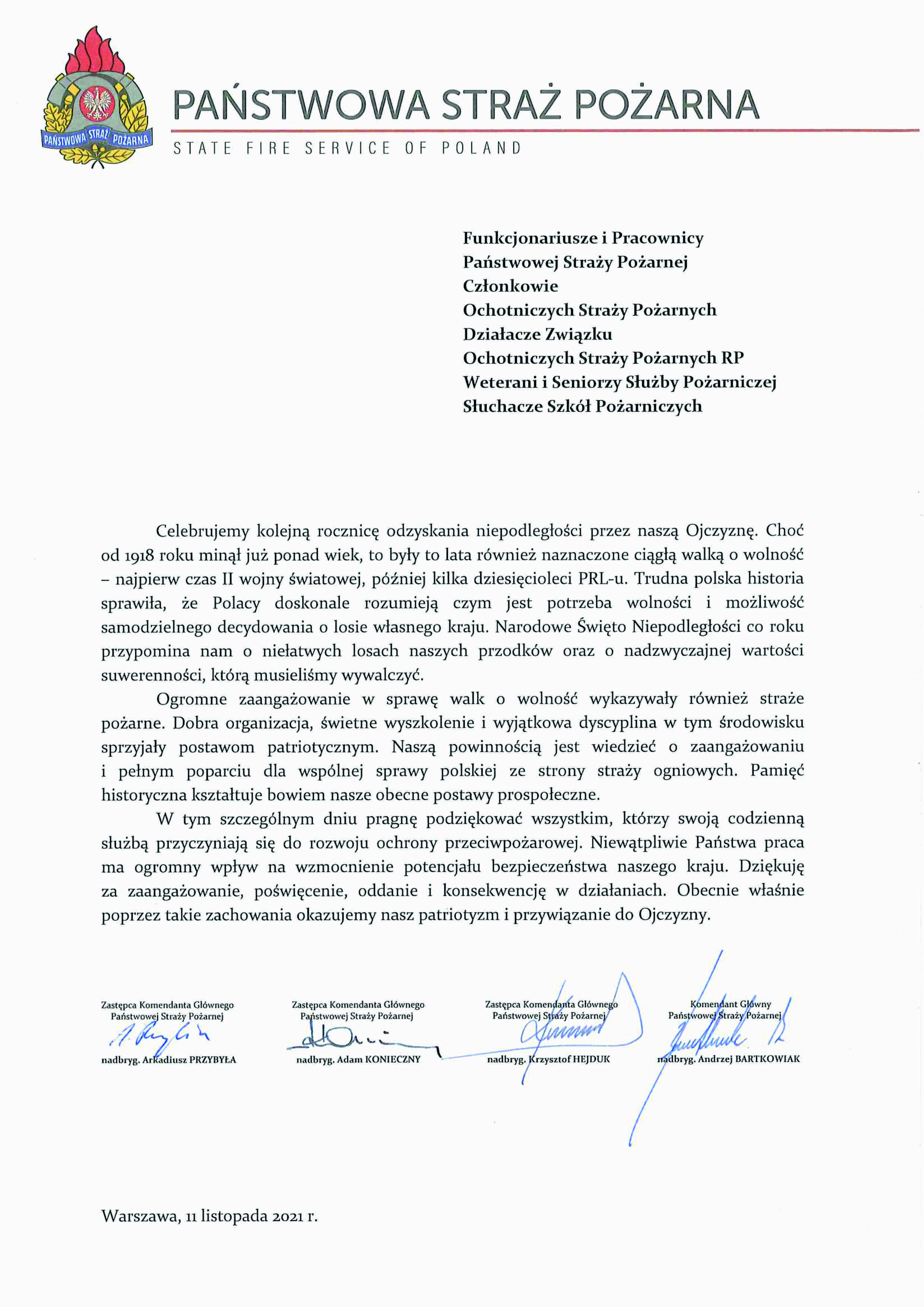 W dniu 11 listopada tradycyjnie obchodzimy Narodowy Dzień Niepodległości, z tej okazji Komendant Główny PSP przekazała list z życzeniami dla wszystkich strażaków.